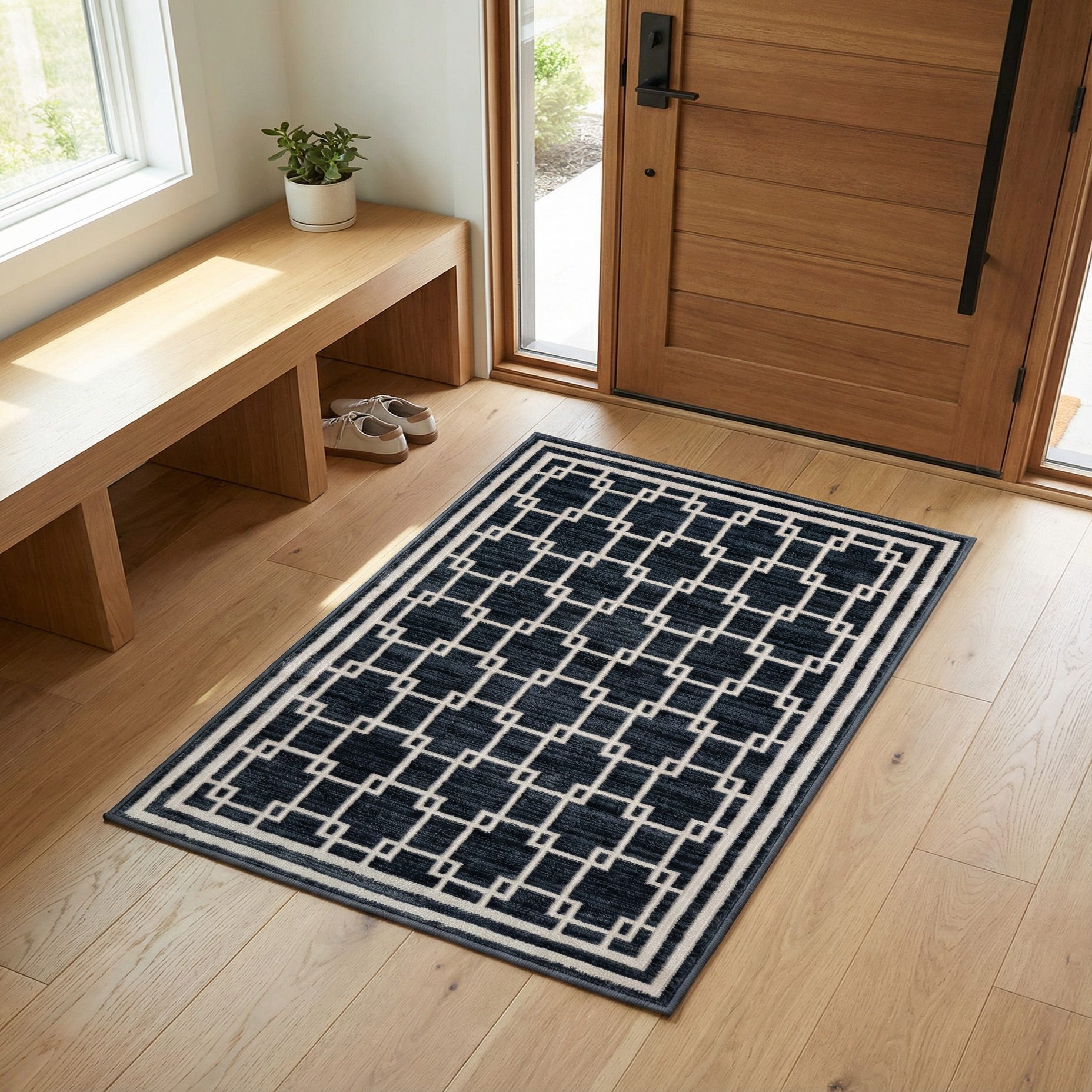 Primary color is Navy Blue. Colors in this rug include: Navy Blue, Ivory.
