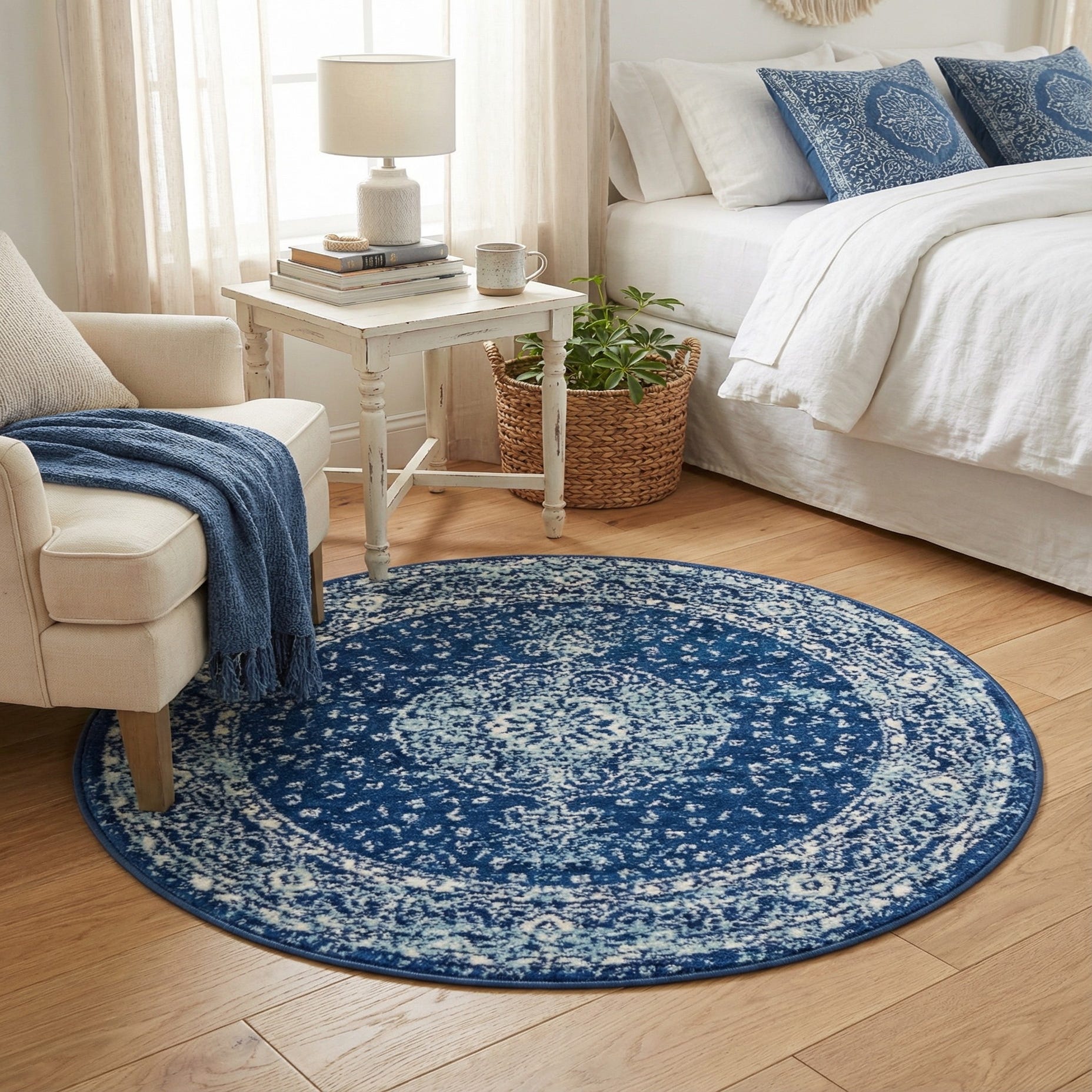 Primary color is Navy Blue. Colors in this rug include: Navy Blue, Blue, Ivory.