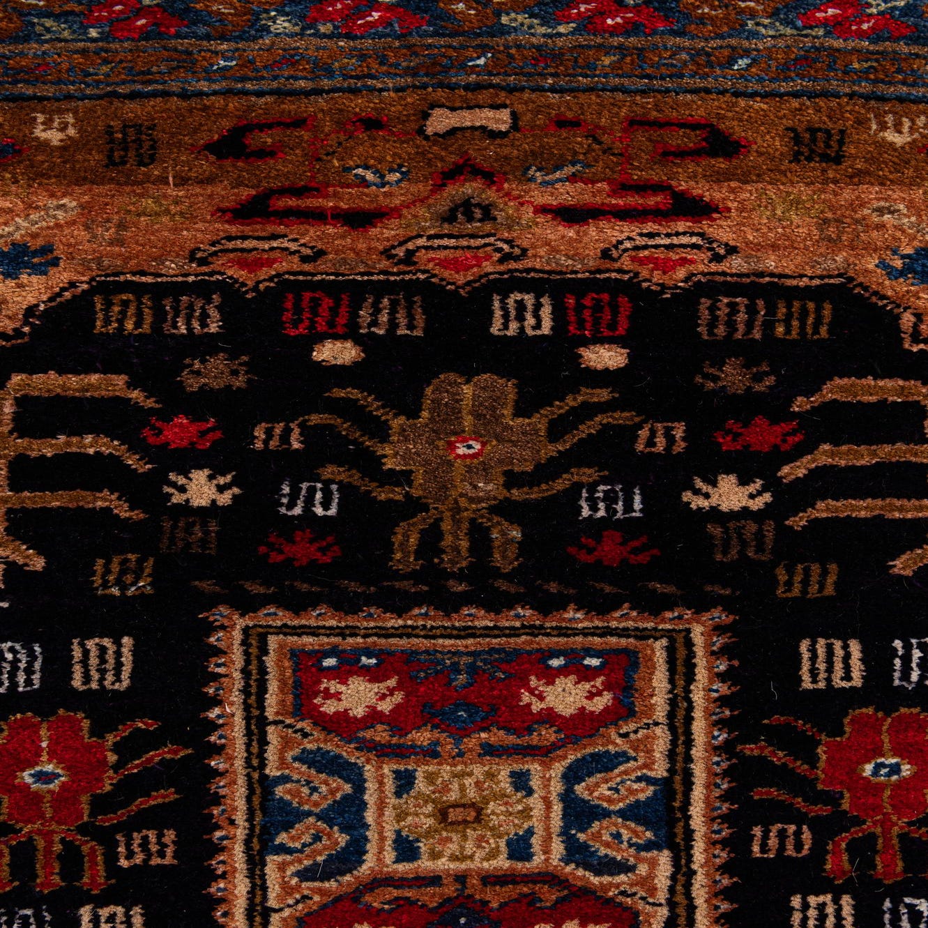 Primary color is Navy Blue. Colors in this rug include: Navy Blue, Beige, Brown, Red, Ivory.