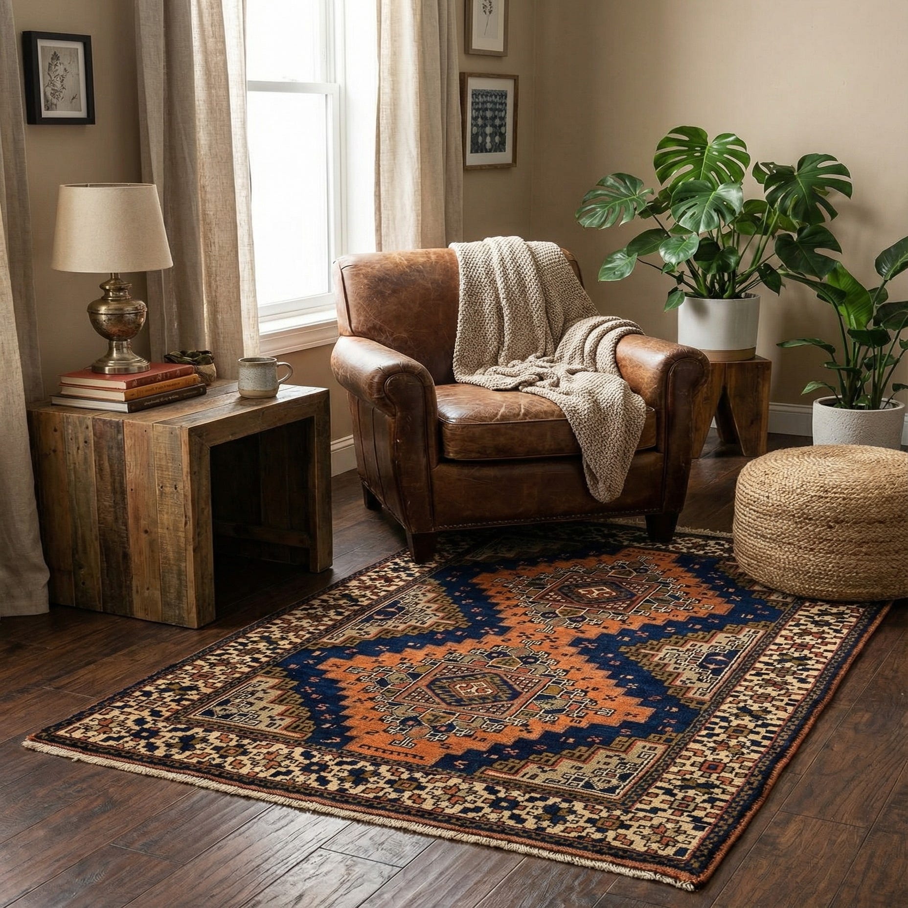 Primary color is Navy Blue. Colors in this rug include: Navy Blue, Brown, Ivory, Terracotta, Olive.