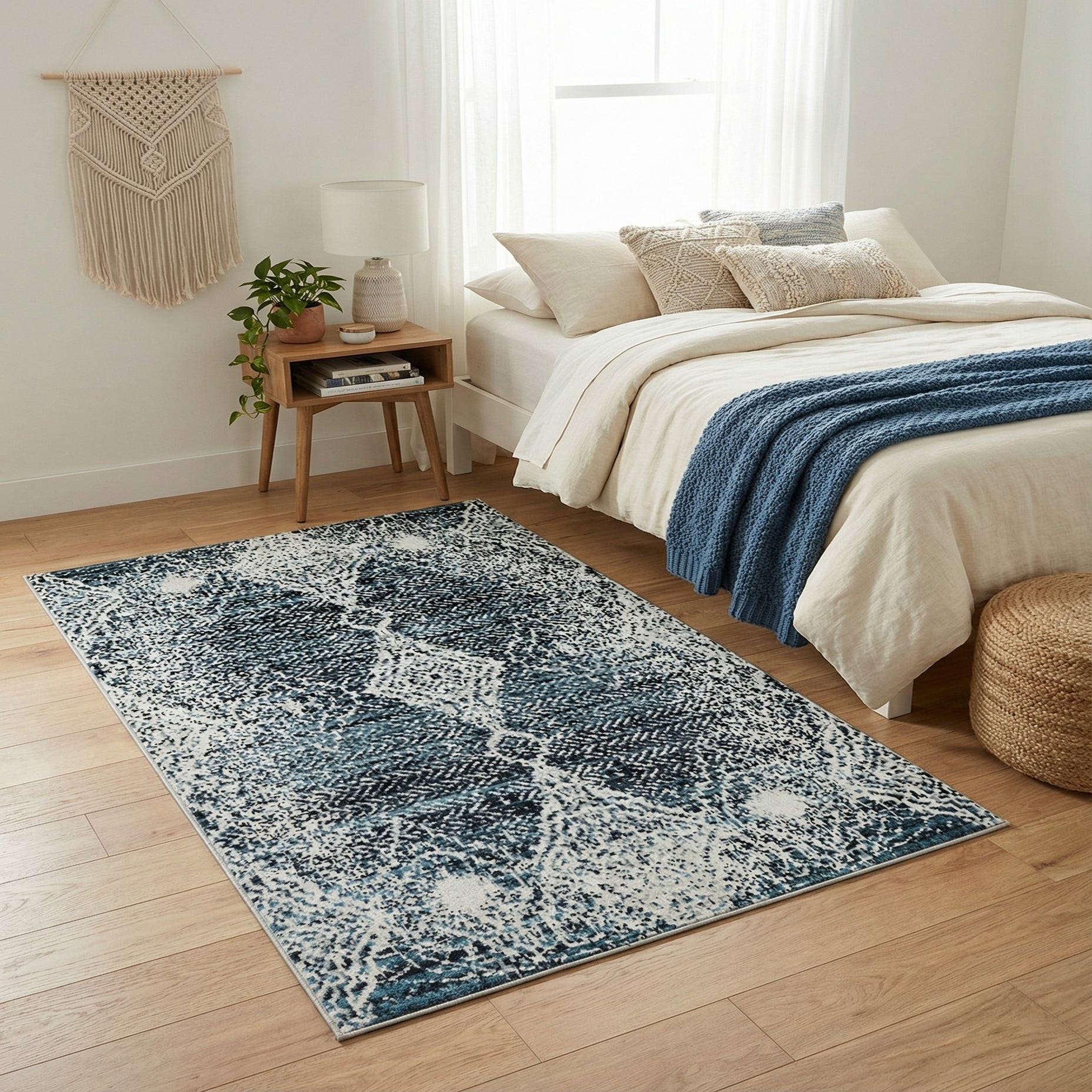 Primary color is Navy Blue. Colors in this rug include: Navy Blue, Light Blue.