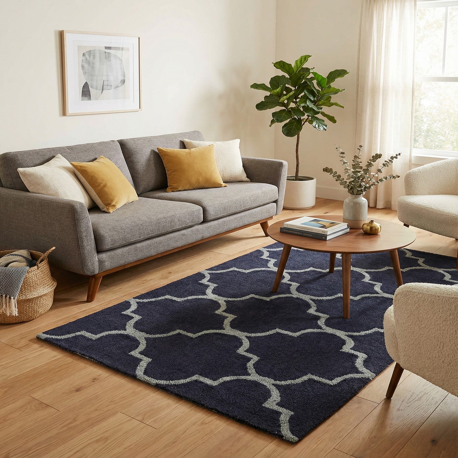 Primary color is Navy Blue. Colors in this rug include: Navy Blue, Gray.