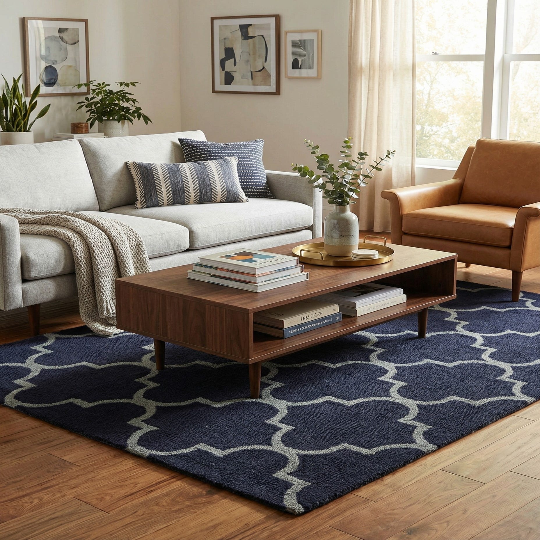 Primary color is Navy Blue. Colors in this rug include: Navy Blue, Gray.