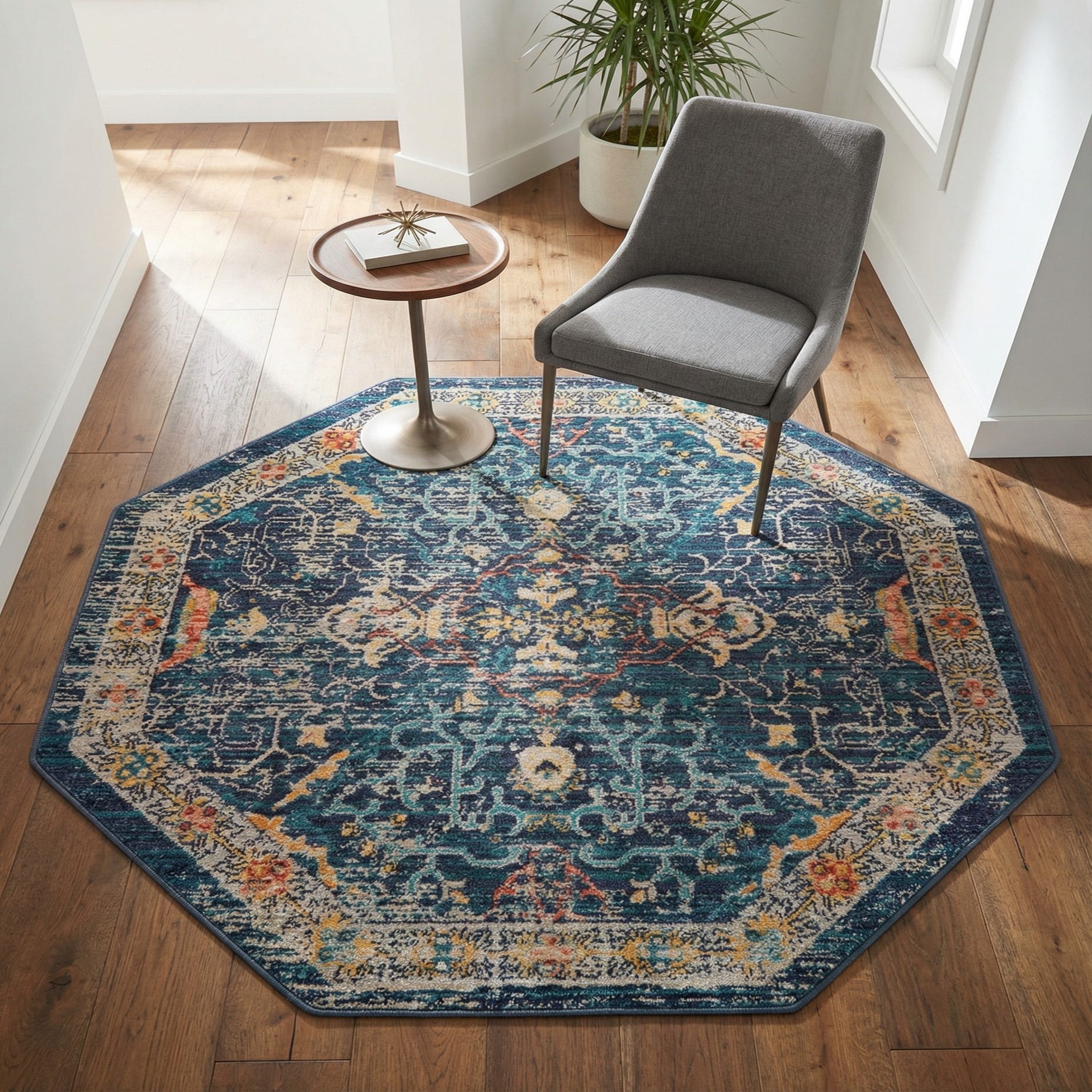 Primary color is Navy Blue. Colors in this rug include: Navy Blue, Brown, Light Blue, Orange, Red, Yellow, Ivory.