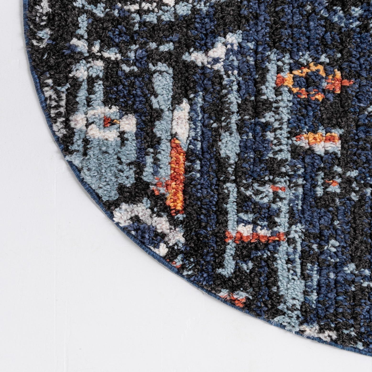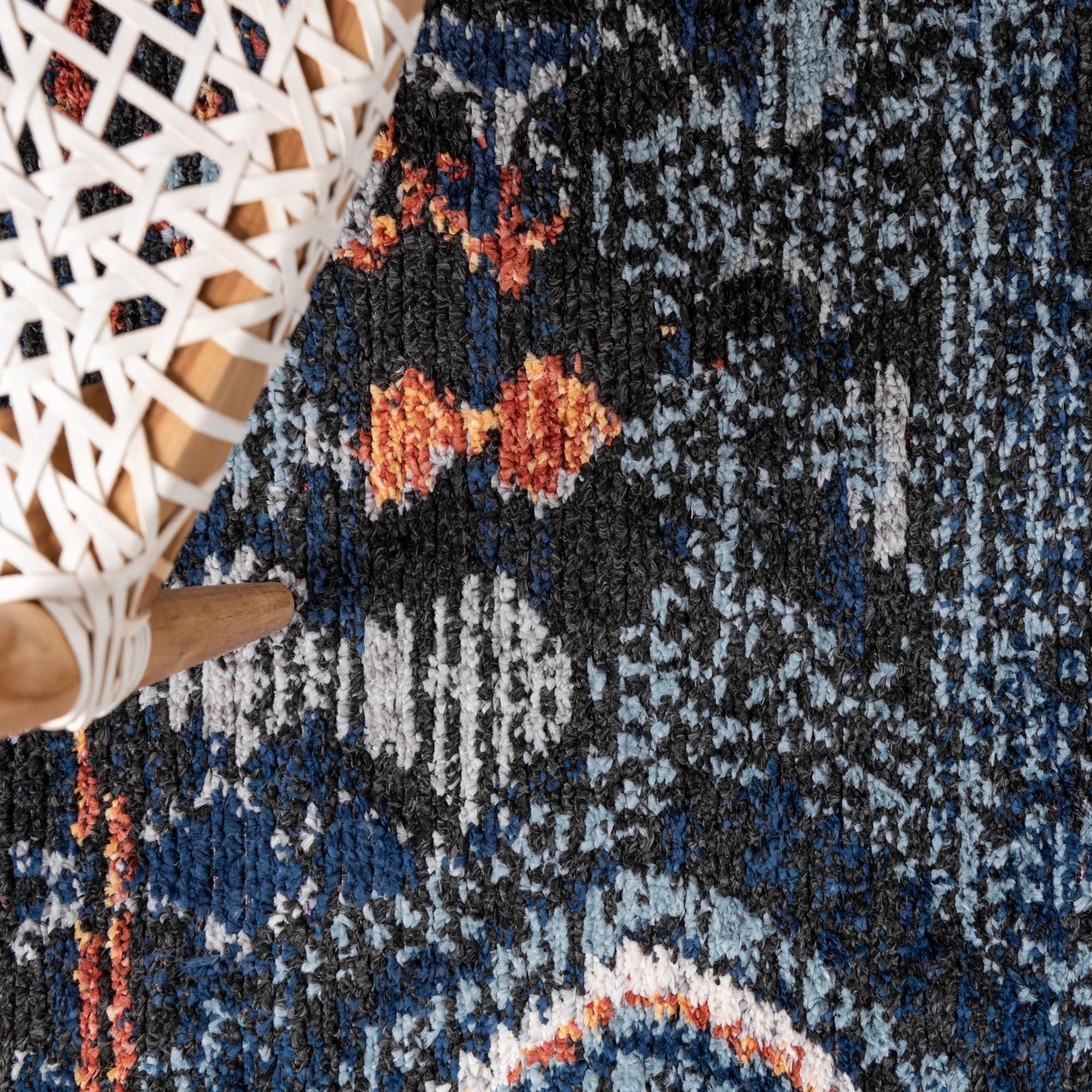 Primary color is Navy Blue. Colors in this rug include: Navy Blue, Black, Ivory, Rust Red, Yellow.