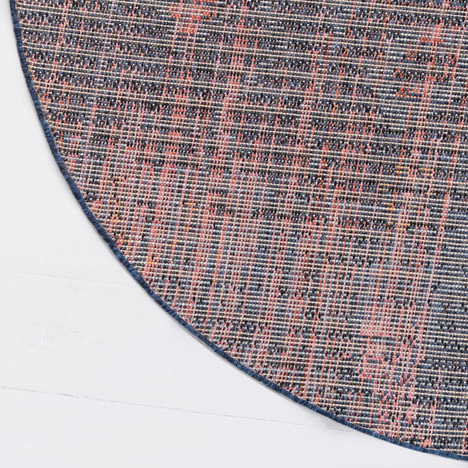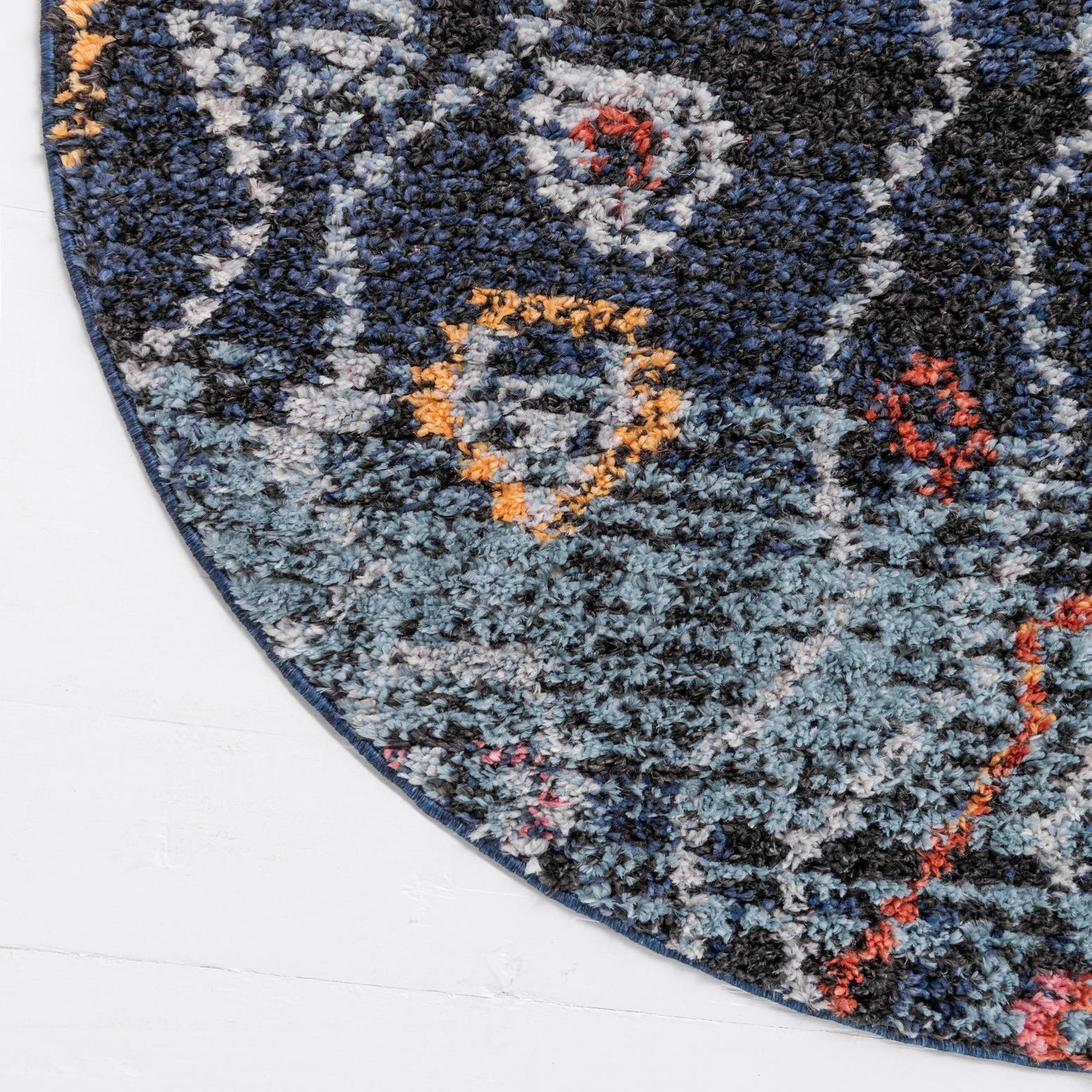 Primary color is Navy Blue. Colors in this rug include: Navy Blue, Black, Gray, Ivory, Light Blue, Rust Red, Yellow, Pink.