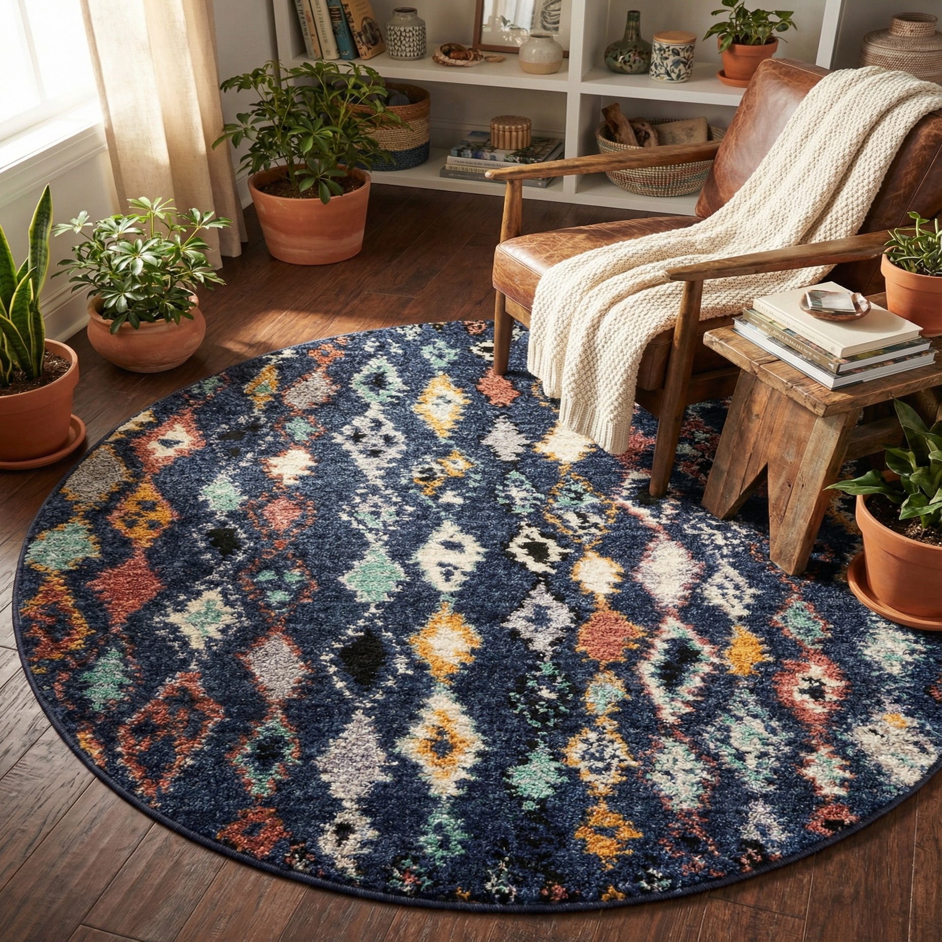 Primary color is Navy Blue. Colors in this rug include: Navy Blue, Black, Ivory, Light Blue, Rust Red, Yellow, Pink, Gray.