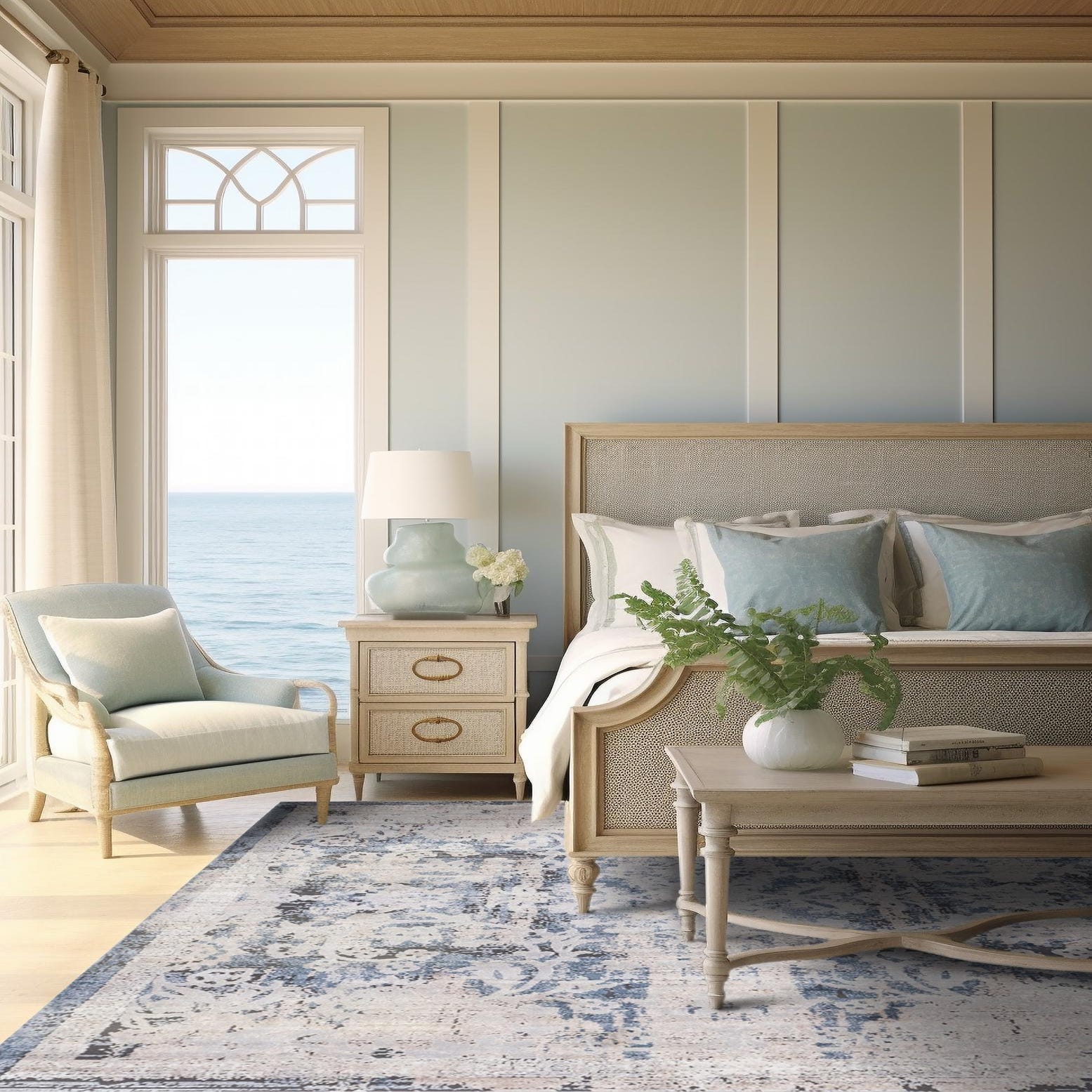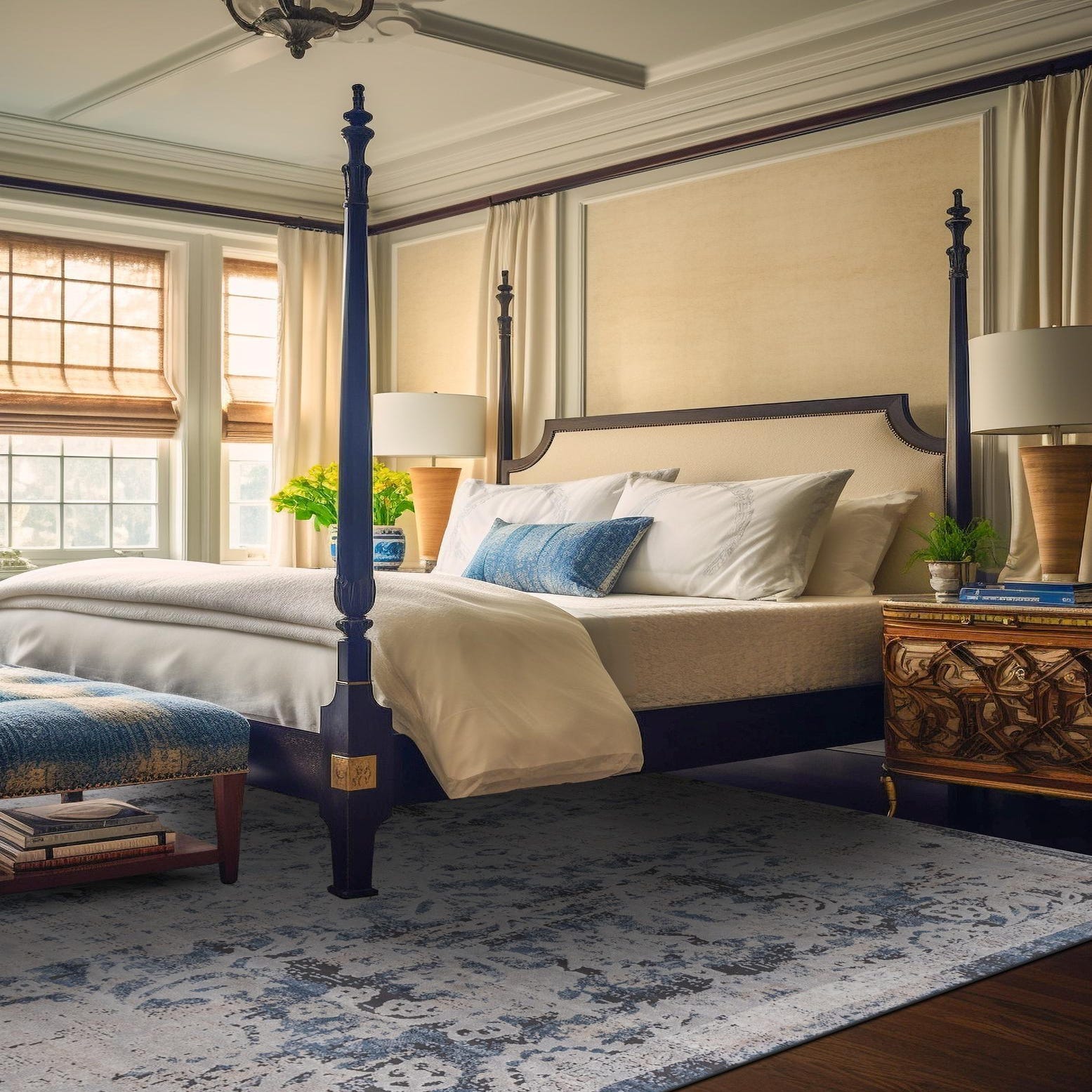 Primary color is Navy Blue. Colors in this rug include: Navy Blue, Beige, Gray, Ivory.