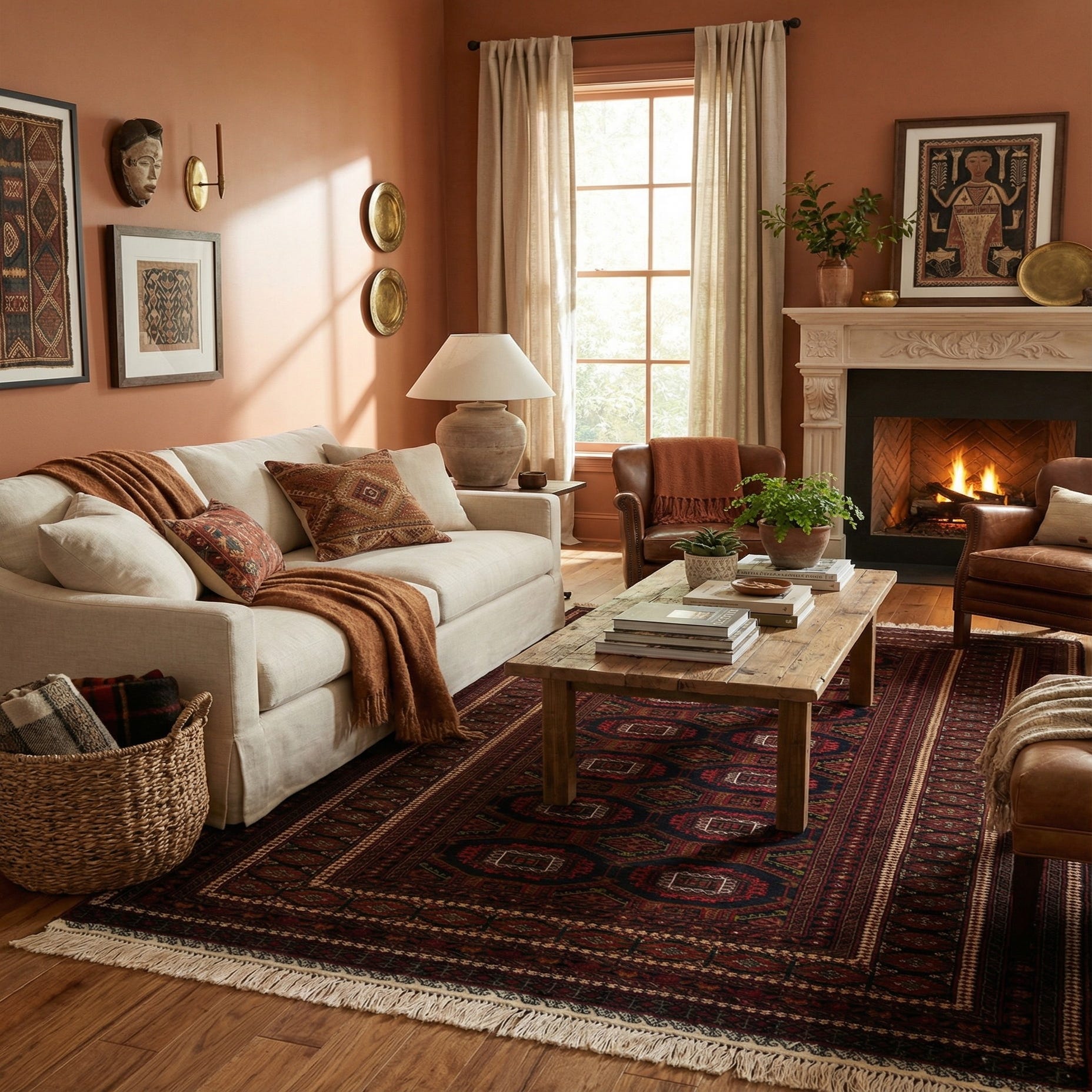 Primary color is Navy Blue. Colors in this rug include: Navy Blue, Beige, Black, Brown, Ivory, Orange.