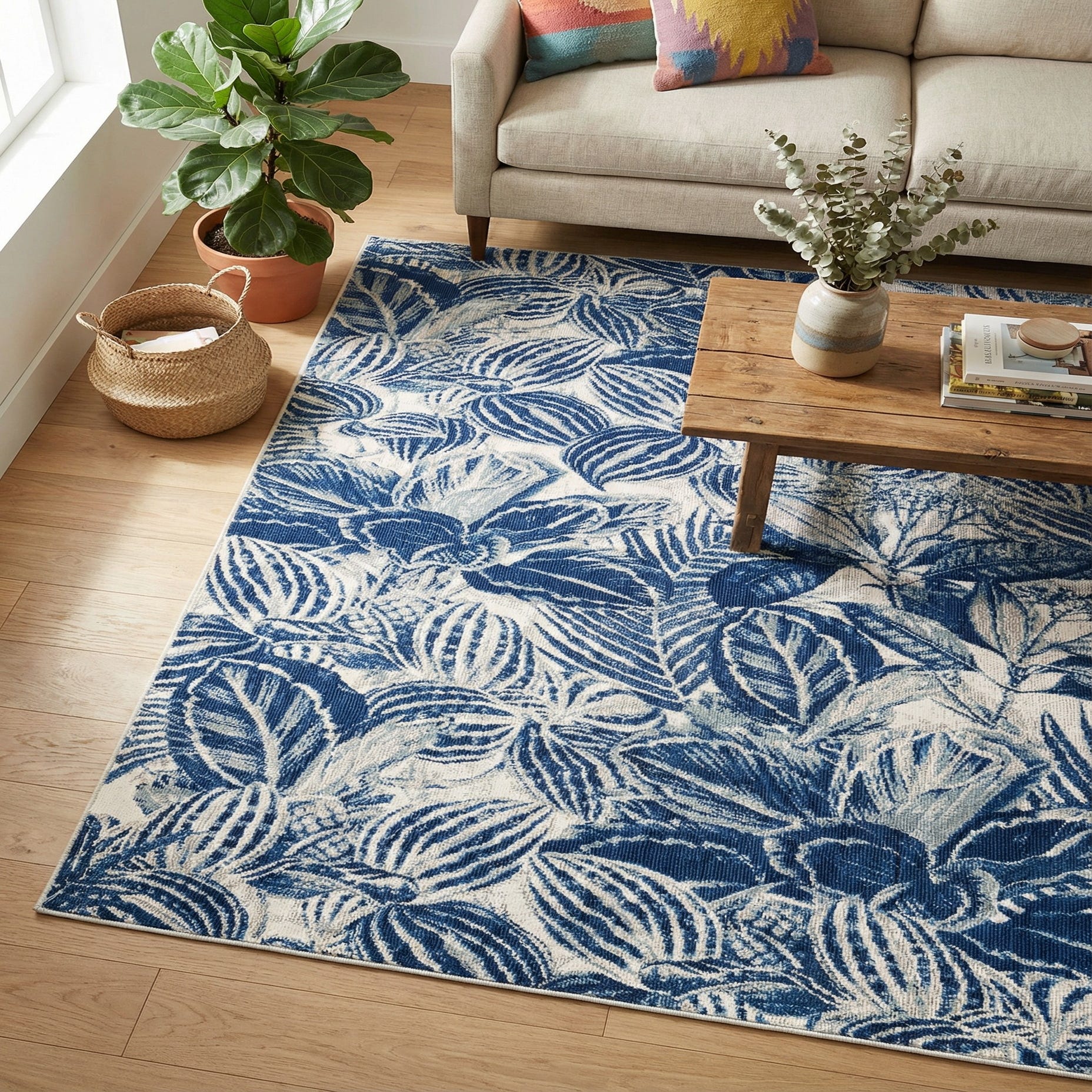 Primary color is Navy Blue. Colors in this rug include: Navy Blue, Ivory, Gray, Light Blue.