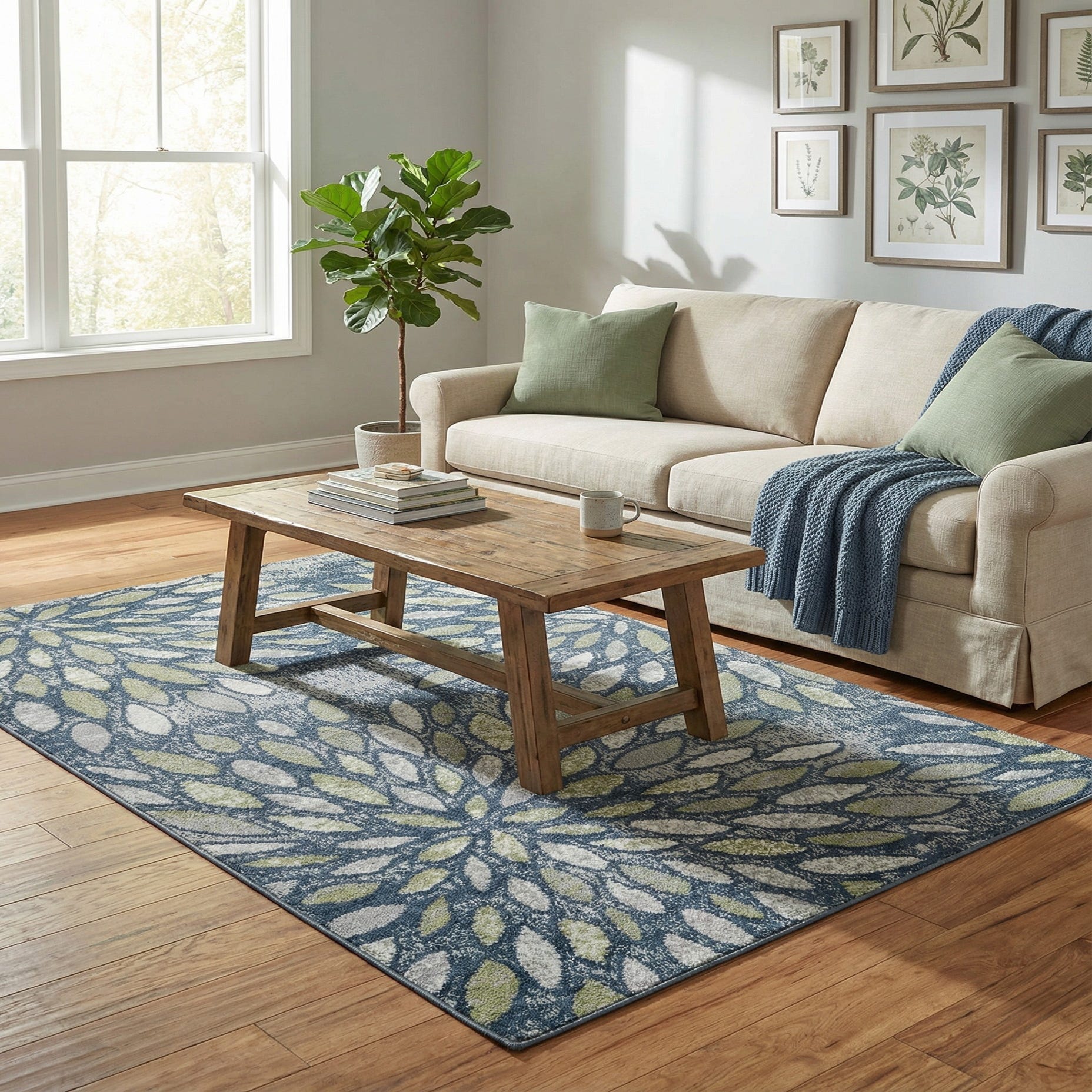 Primary color is Navy Blue. Colors in this rug include: Navy Blue, Ivory, Light Green, Gray.