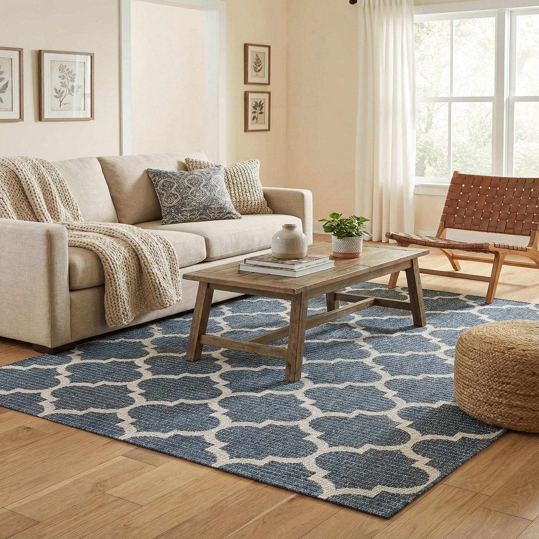 Primary color is Navy Blue. Colors in this rug include: Navy Blue, Ivory.