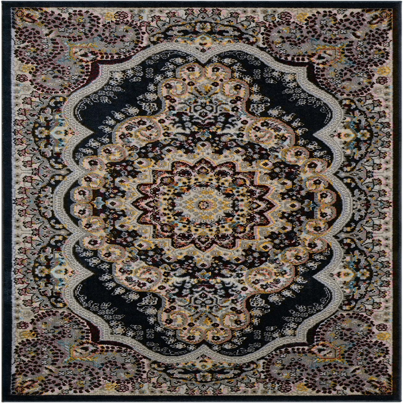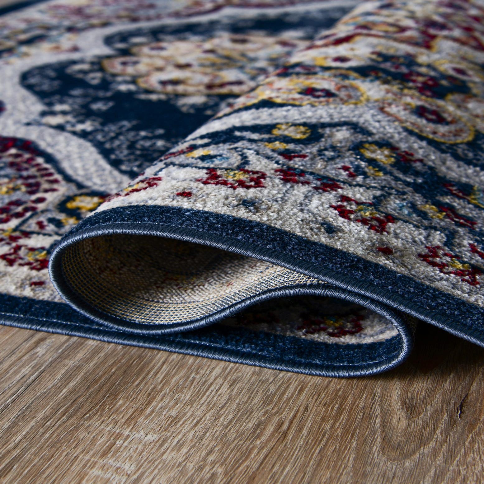 Primary color is Navy Blue. Colors in this rug include: Navy Blue, Gray, Ivory, Red, Yellow.
