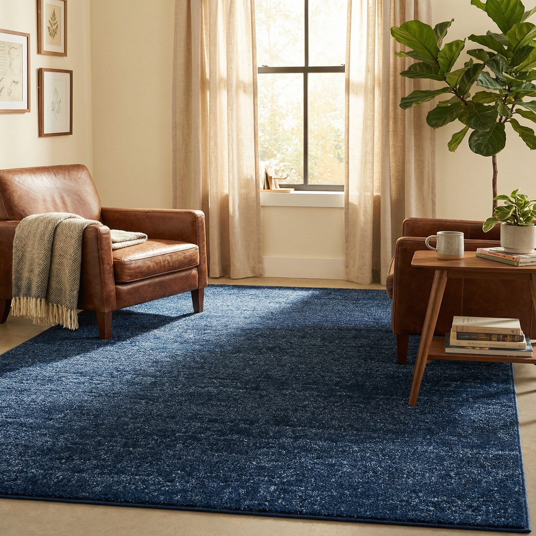 Primary color is Navy Blue. Colors in this rug include: Navy Blue, Ivory.