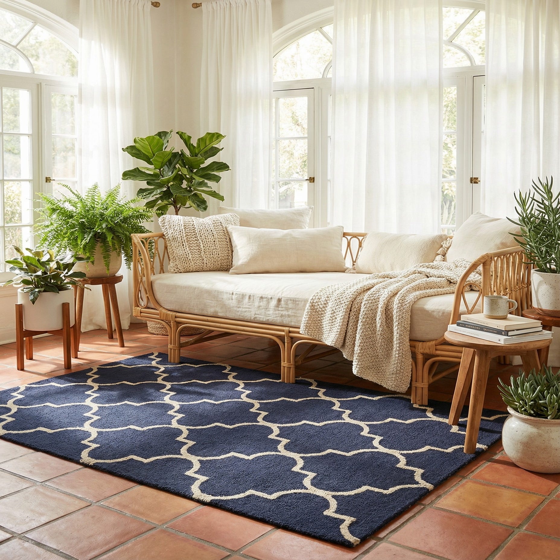 Primary color is Navy Blue. Colors in this rug include: Navy Blue, Beige.