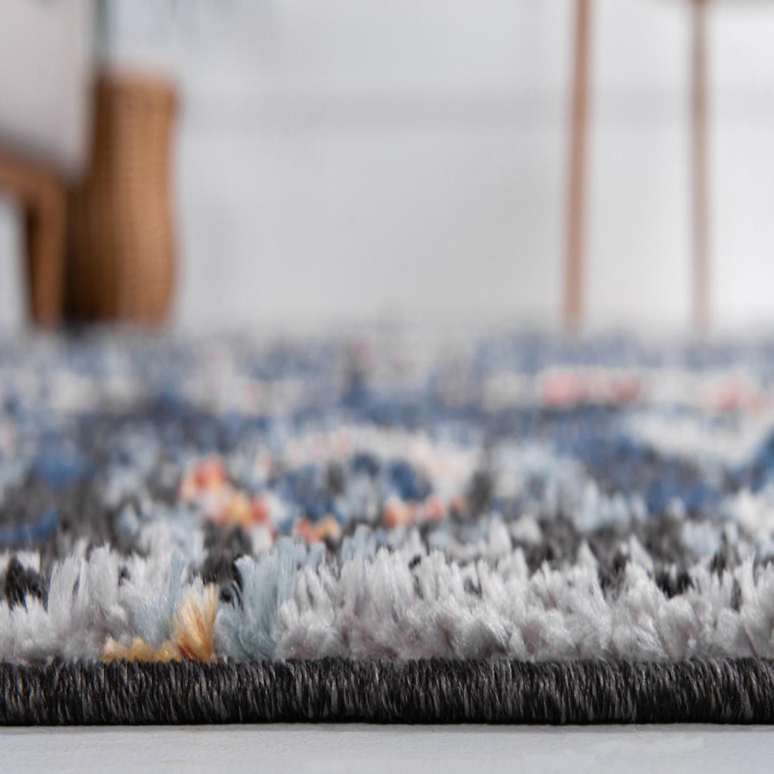 Primary color is Navy Blue. Colors in this rug include: Navy Blue, Black, Ivory, Rust Red, Yellow.