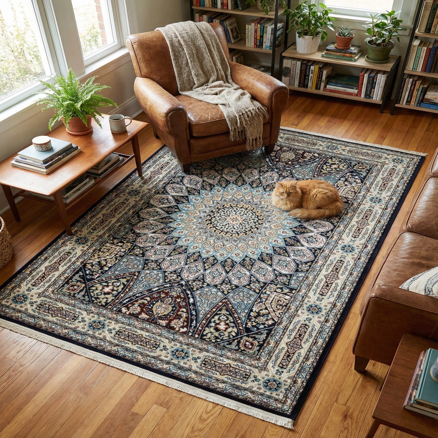 Primary color is Navy Blue. Colors in this rug include: Navy Blue, Beige, Blue, Burgundy, Cream, Green, Ivory, Light Green, Puce.