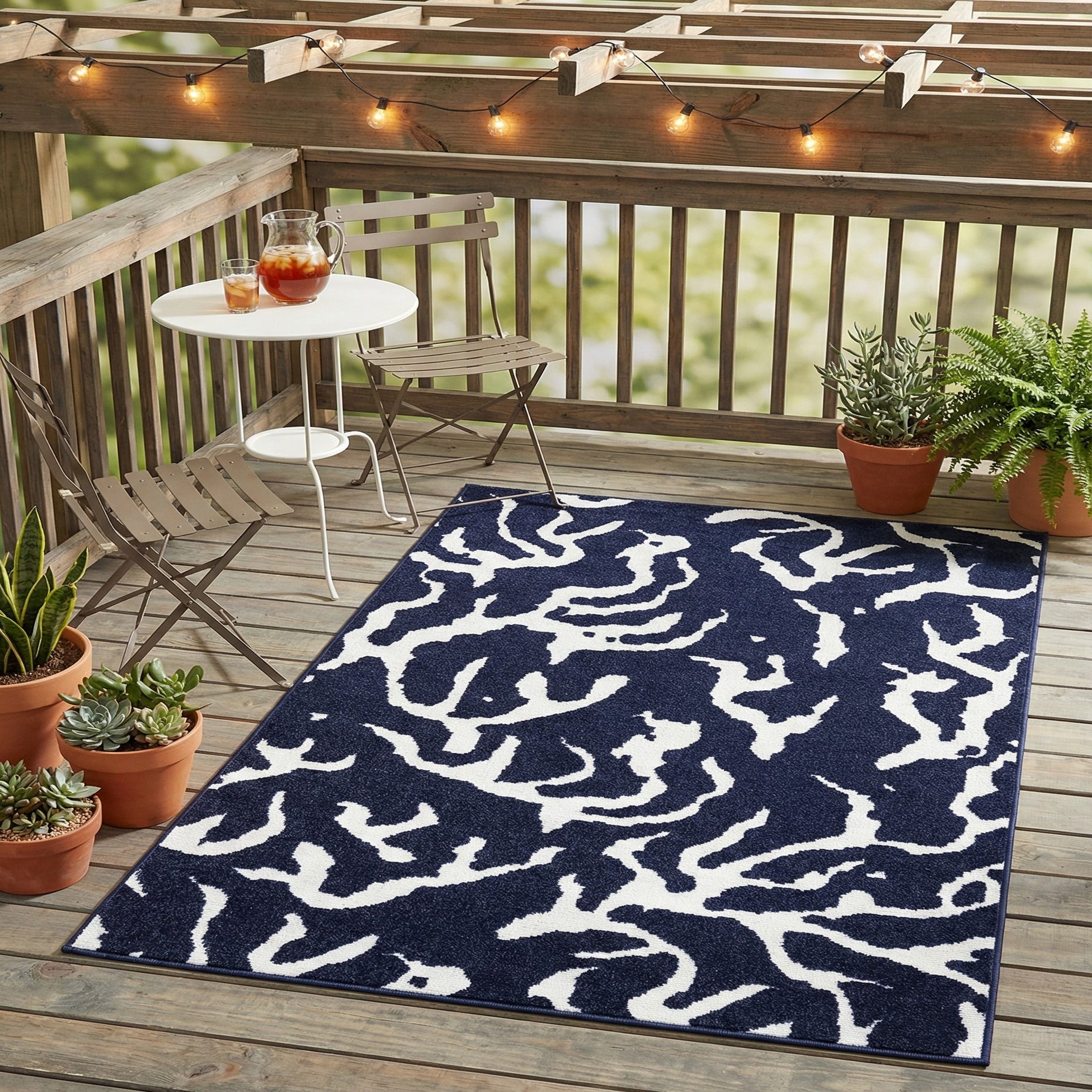 Primary color is Navy Blue. Colors in this rug include: Navy Blue, Ivory.