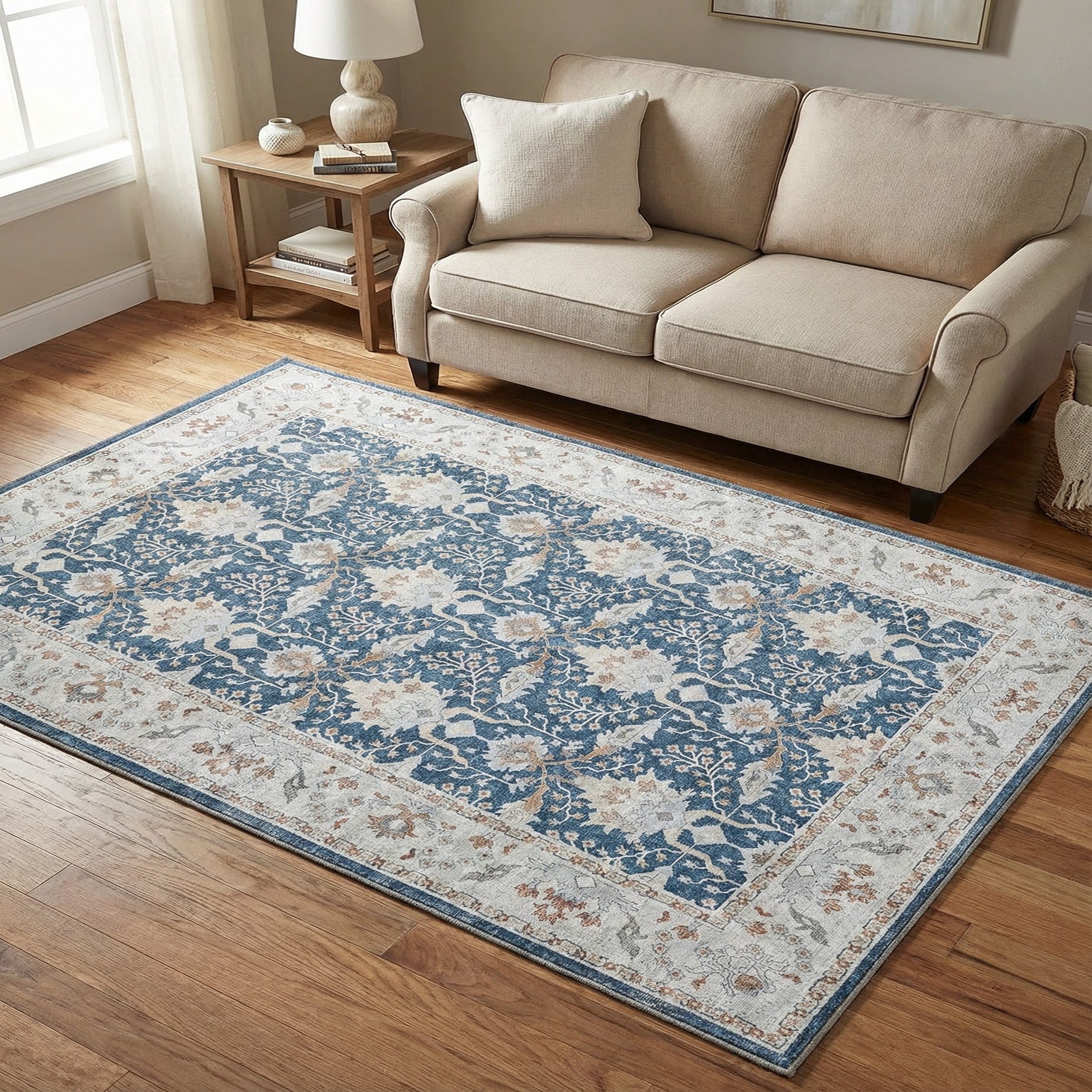 Primary color is Navy Blue. Colors in this rug include: Navy Blue, Brown, Gray, Ivory.