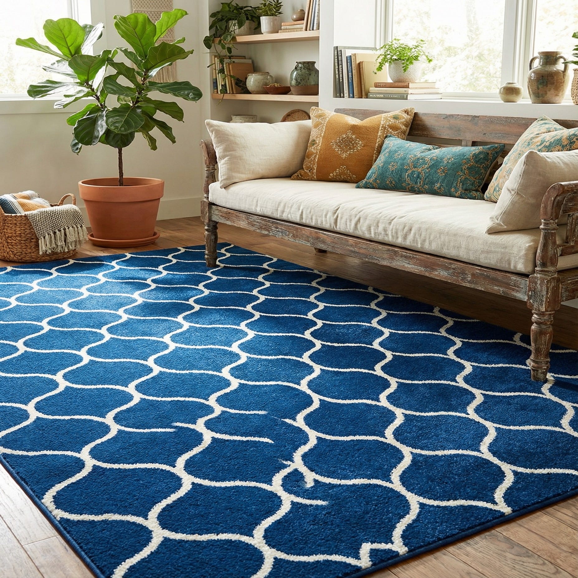Primary color is Navy Blue. Colors in this rug include: Navy Blue, Ivory.