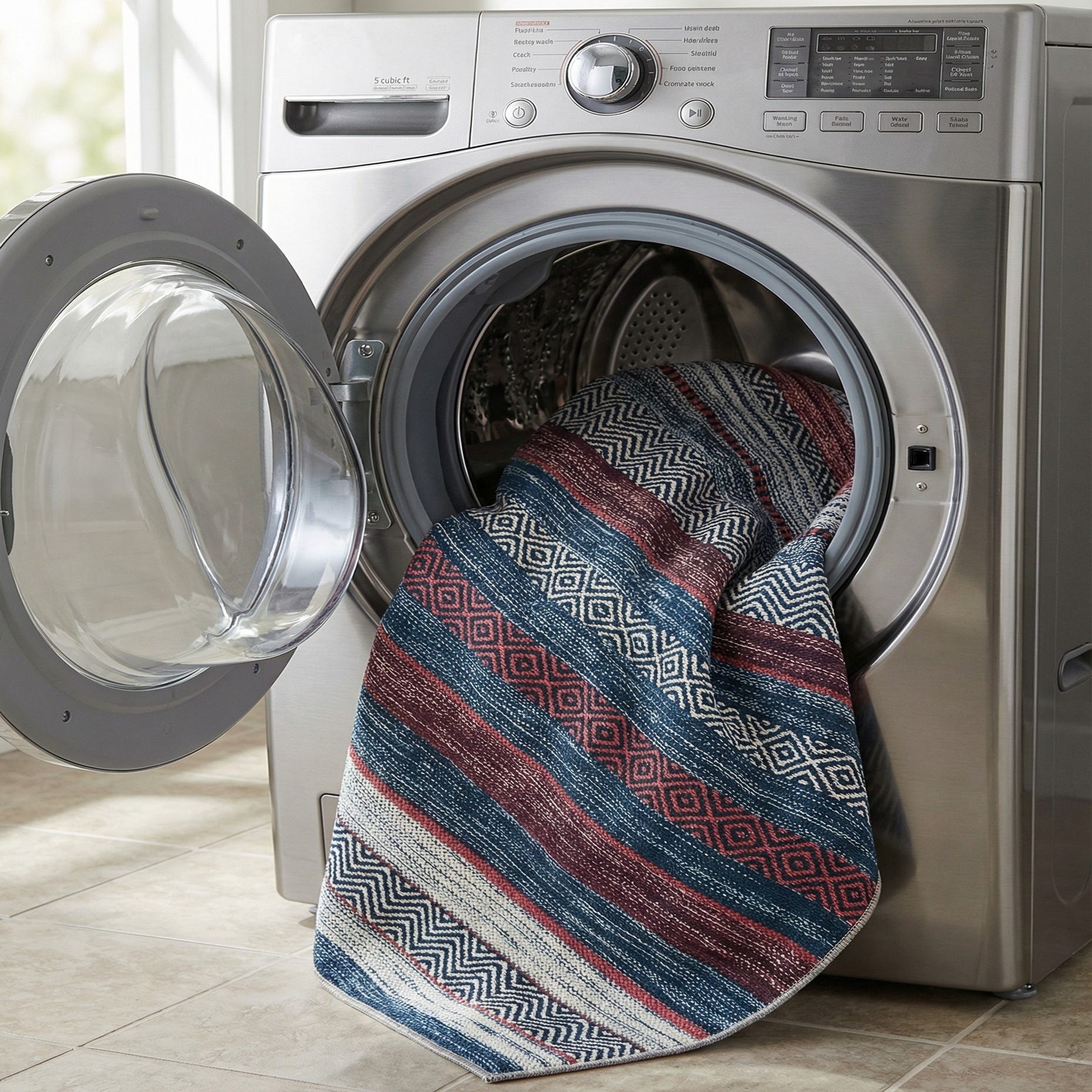 Primary color is Navy Blue. Colors in this rug include: Navy Blue, Blue, Ivory, Light Blue, Red, Pink, Puce.