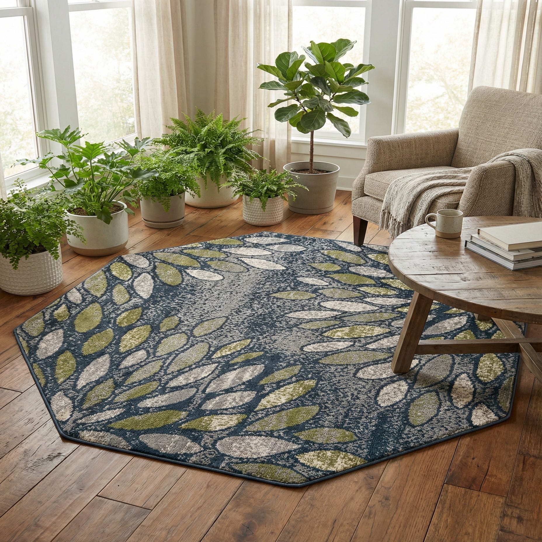 Primary color is Navy Blue. Colors in this rug include: Navy Blue, Ivory, Gray, Light Green.
