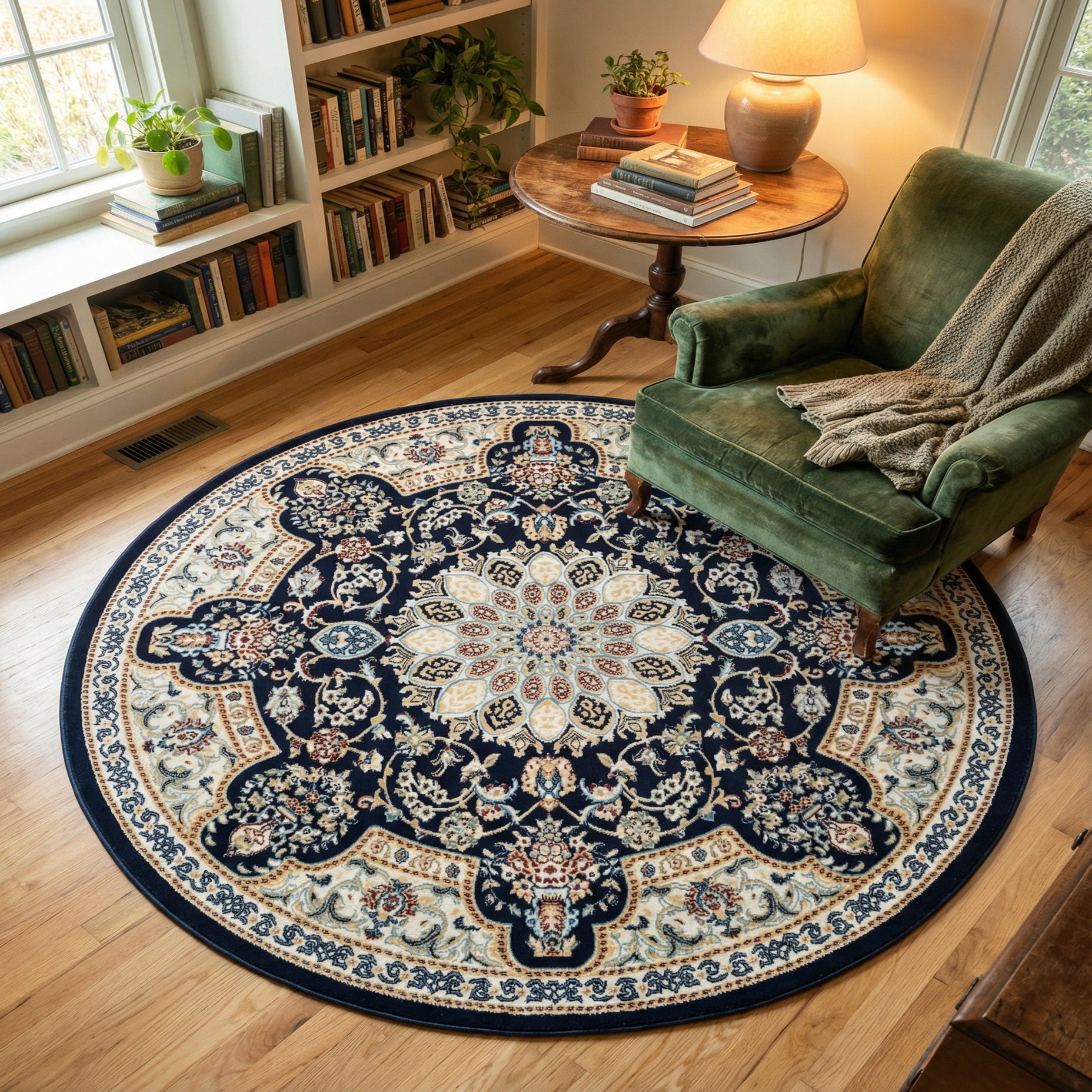 Primary color is Navy Blue. Colors in this rug include: Navy Blue, Beige, Blue, Burgundy, Candy, Cream, Green, Ivory, Puce.