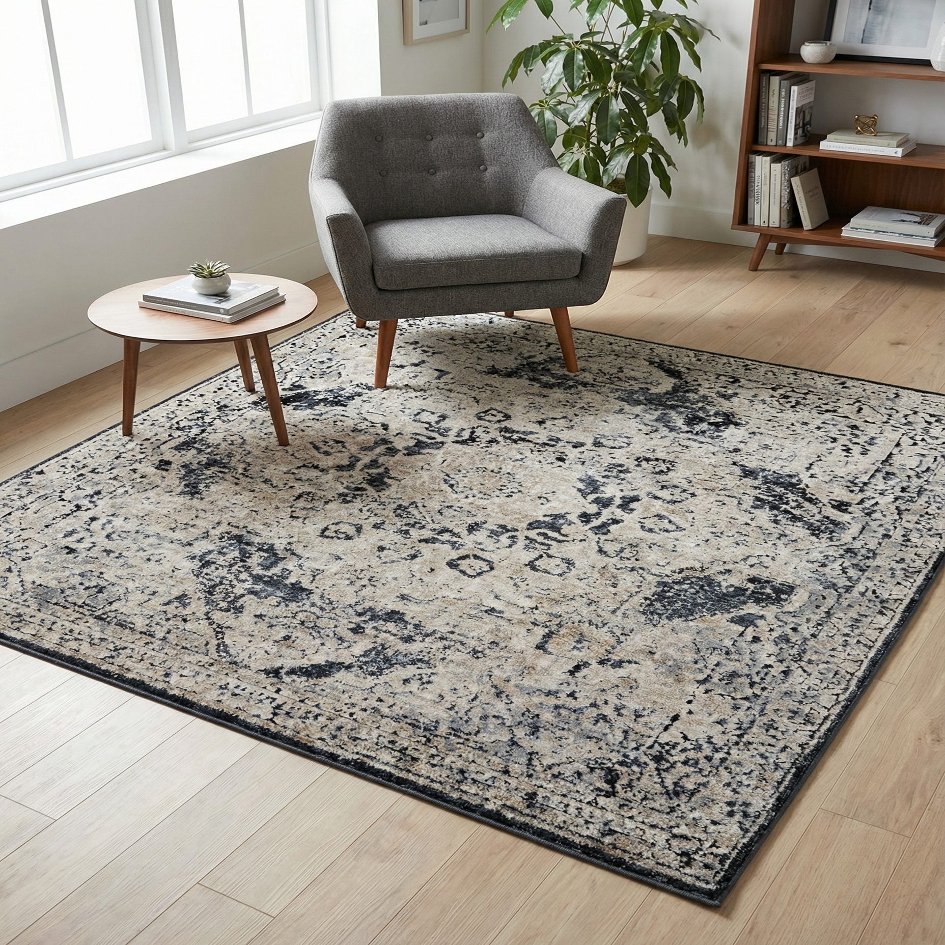 Primary color is Navy Blue. Colors in this rug include: Navy Blue, Beige, Cream, Gray, Ivory.