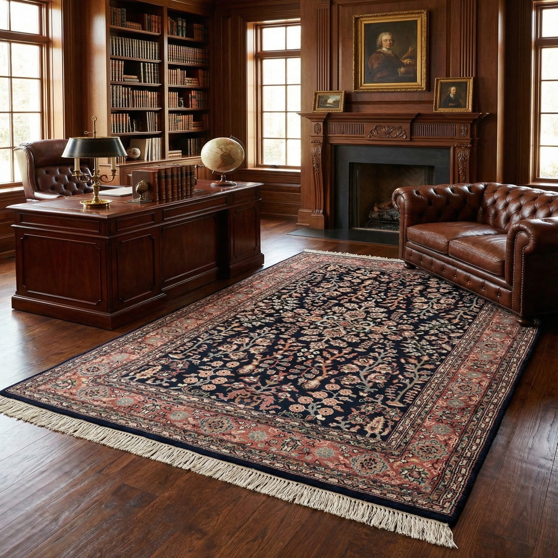 Primary color is Navy Blue. Colors in this rug include: Navy Blue, Brown, Ivory, Puce, Green.