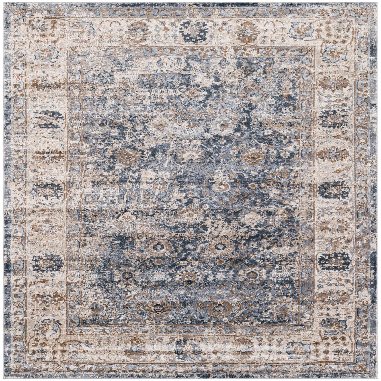 Primary color is Navy Blue. Colors in this rug include: Navy Blue, Brown, Ivory, Gray.