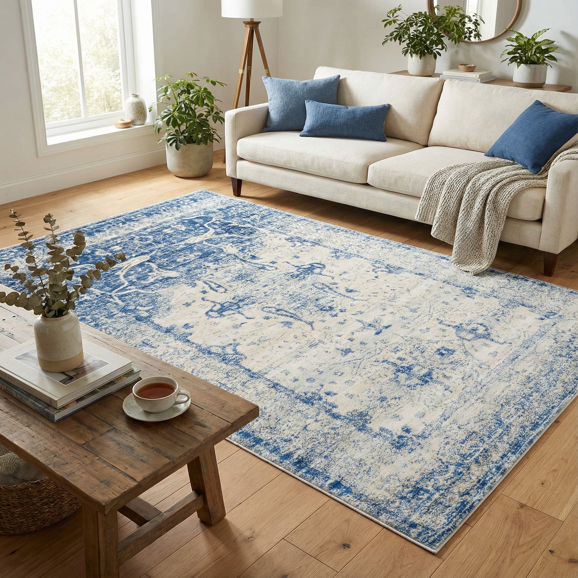 Primary color is Navy Blue. Colors in this rug include: Navy Blue, Beige, Blue, Light Blue.