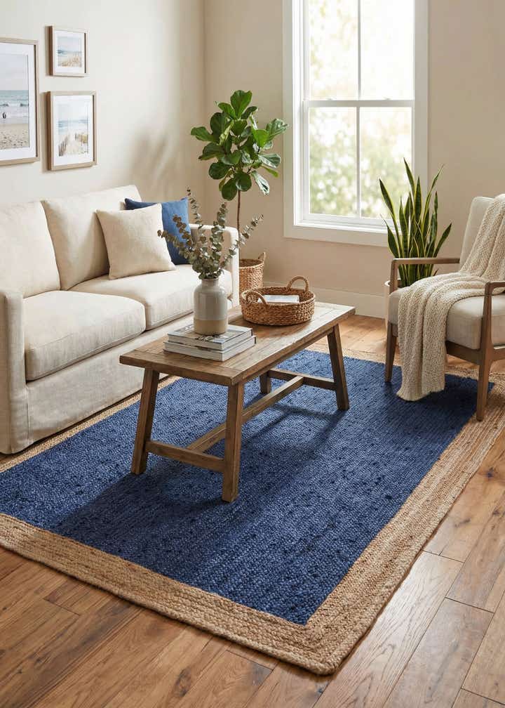 Primary color is Navy Blue. Colors in this rug include: Navy Blue, Tan.