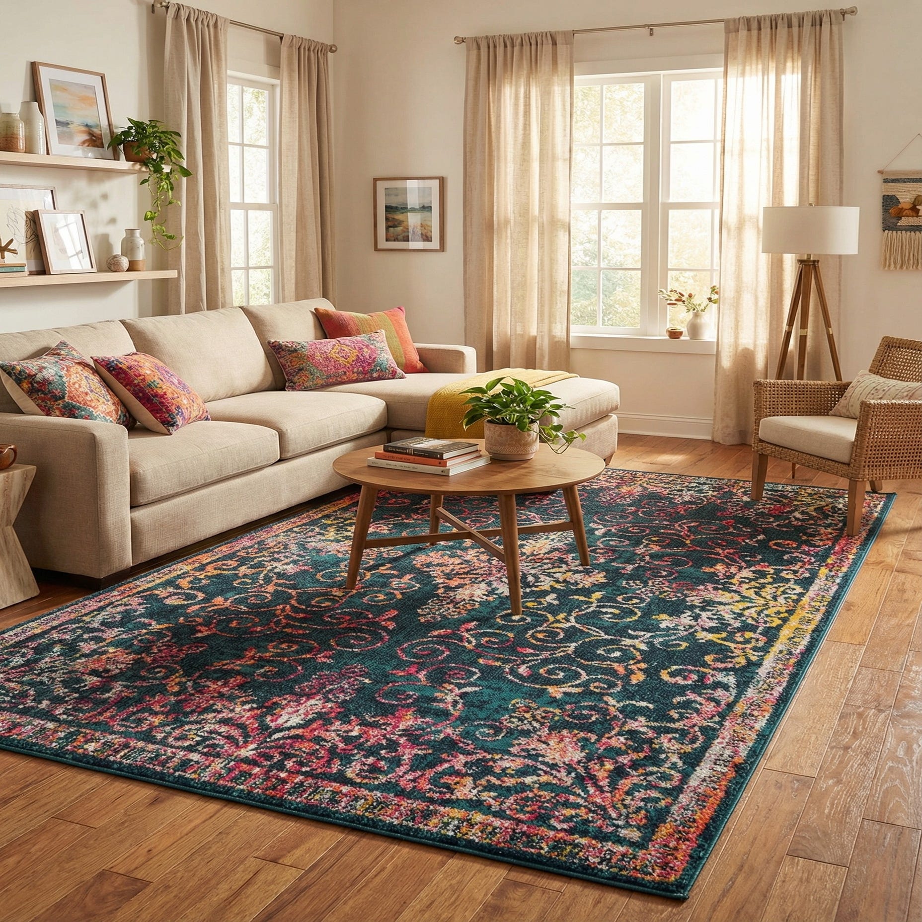Primary color is Navy Blue. Colors in this rug include: Navy Blue, Ivory, Yellow, Pink, Orange, Gray, Red.