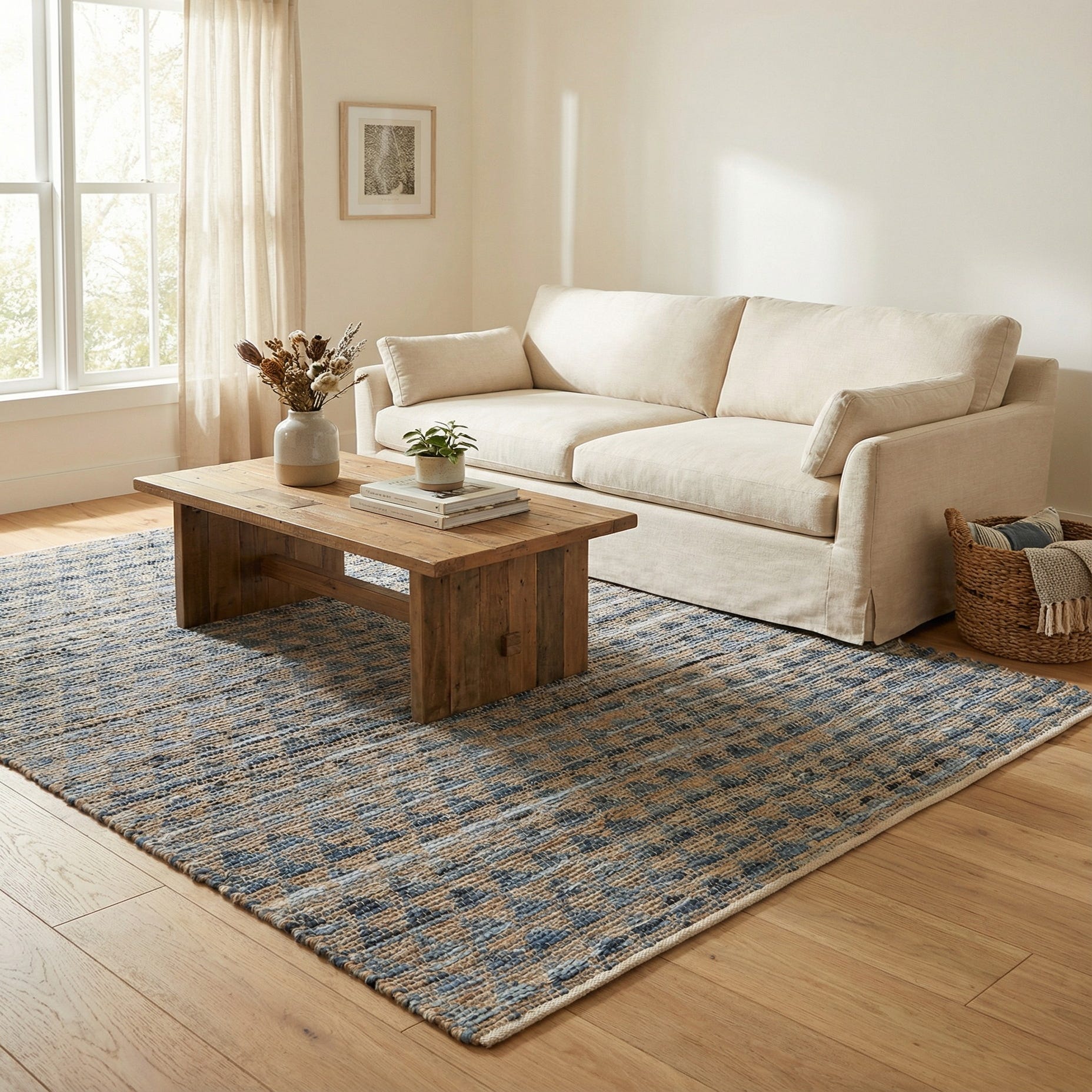 Primary color is Navy Blue. Colors in this rug include: Navy Blue, Natural.