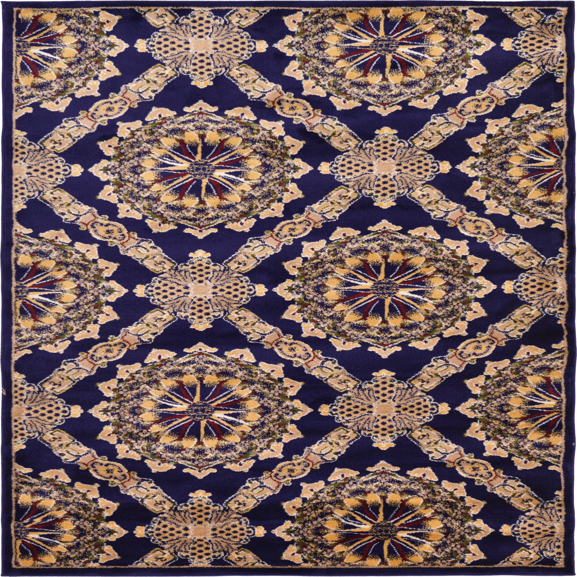 Primary color is Navy Blue. Colors in this rug include: Navy Blue, Burgundy, Cream, Gold, Ivory, Beige.
