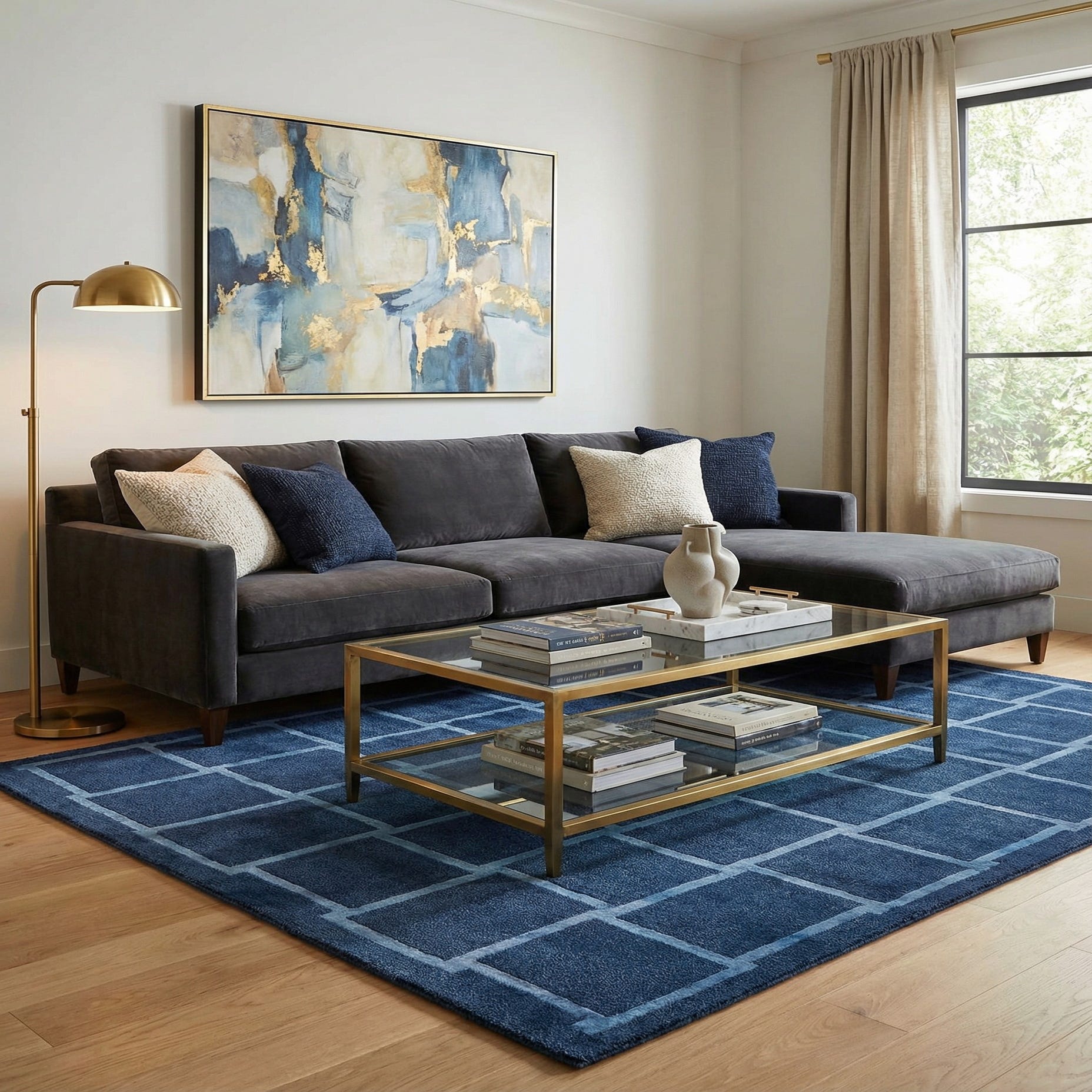 Primary color is Navy Blue. Colors in this rug include: Navy Blue, Blue.
