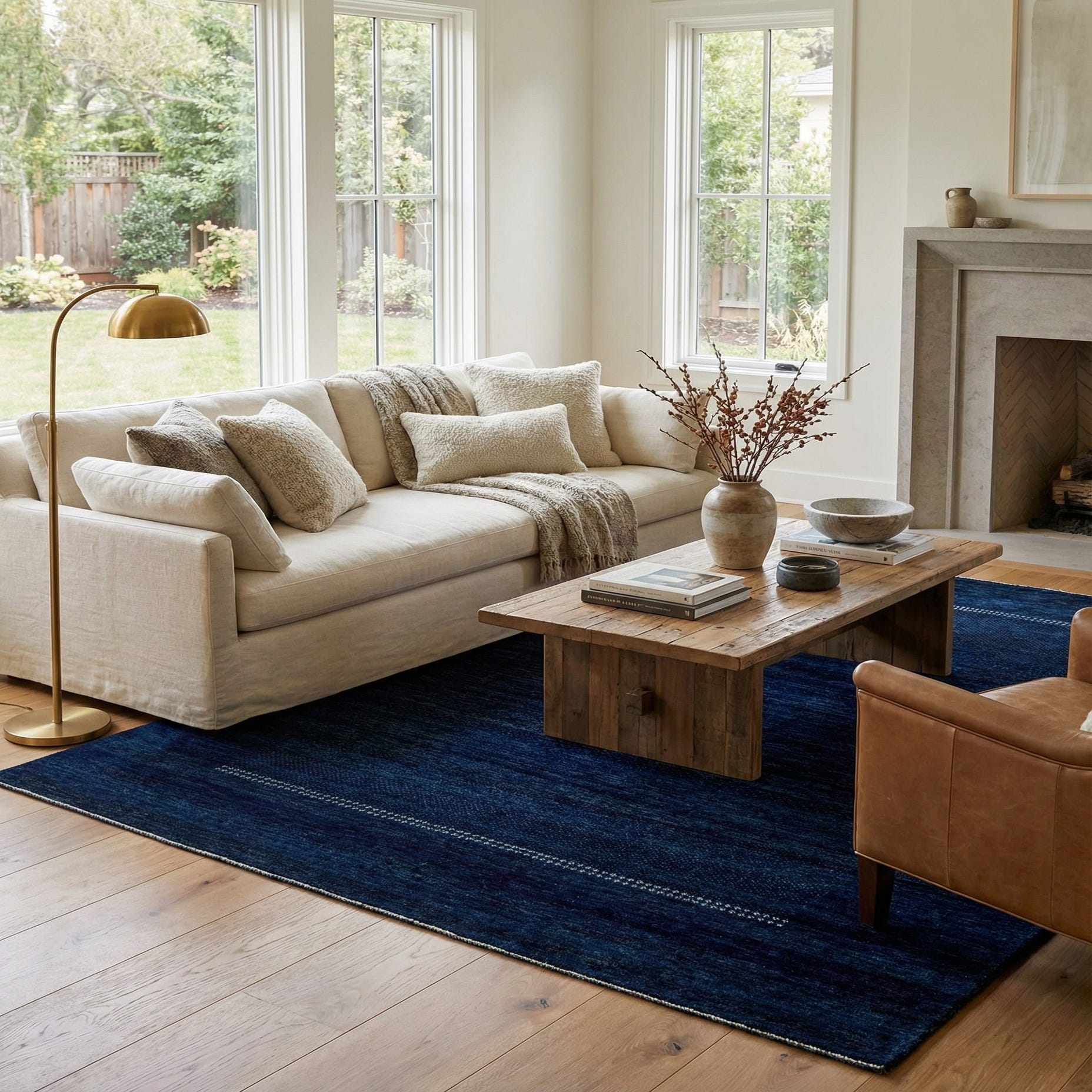 Primary color is Navy Blue. Colors in this rug include: Navy Blue, Black, Ivory.