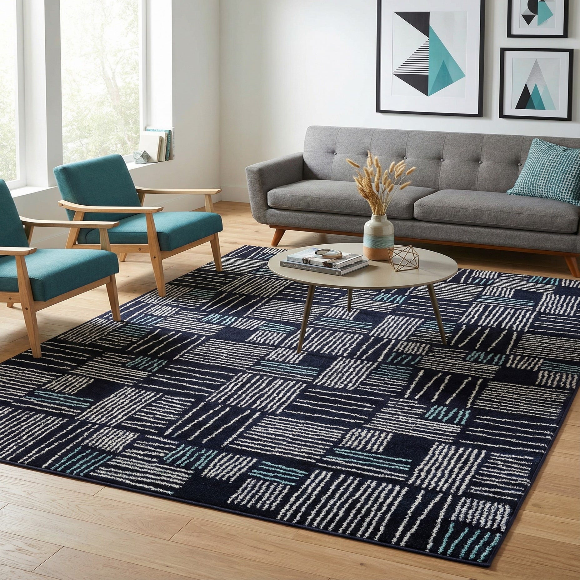 Primary color is Navy Blue. Colors in this rug include: Navy Blue, Ivory, Teal.