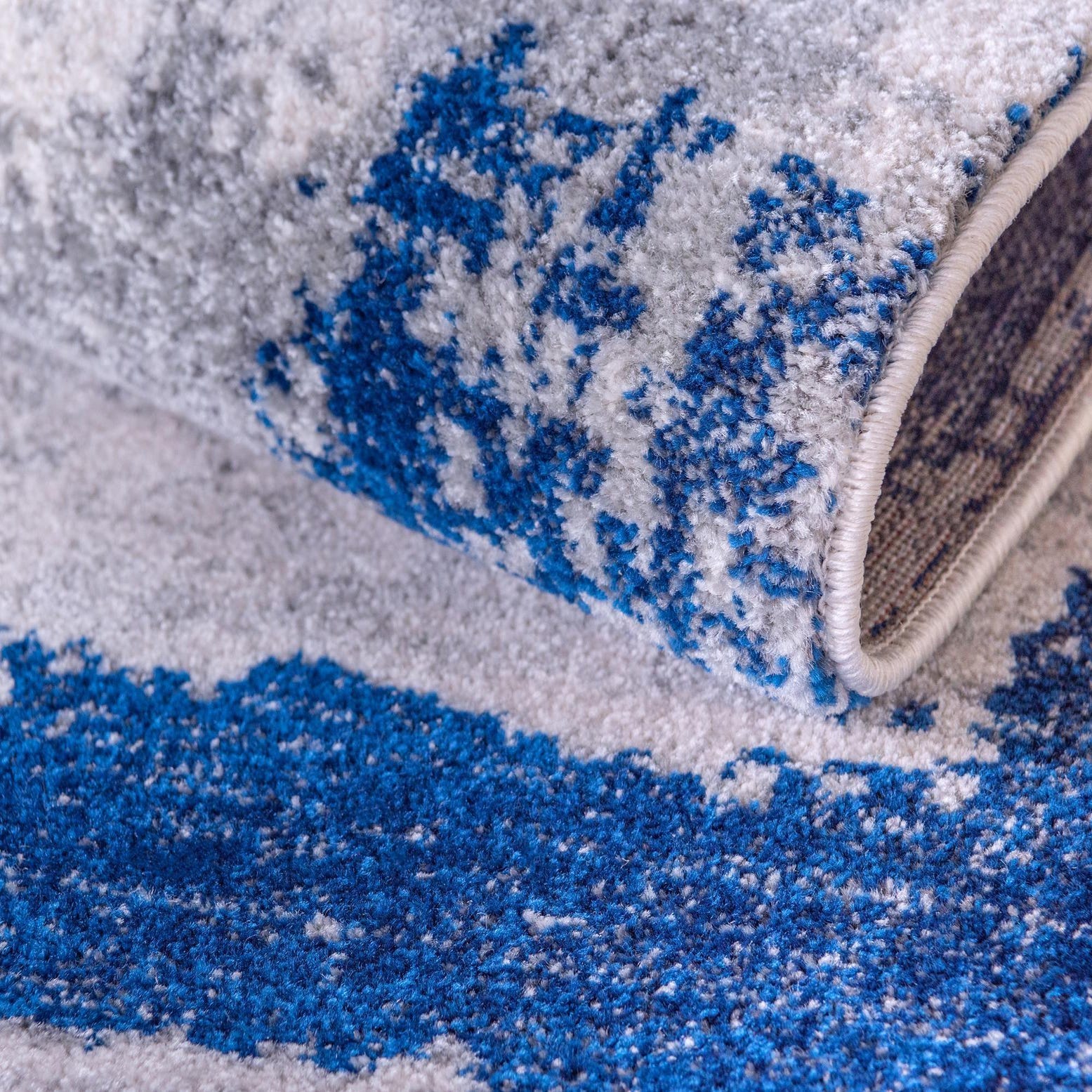 Primary color is Navy Blue. Colors in this rug include: Navy Blue, Gray, Ivory, Blue.