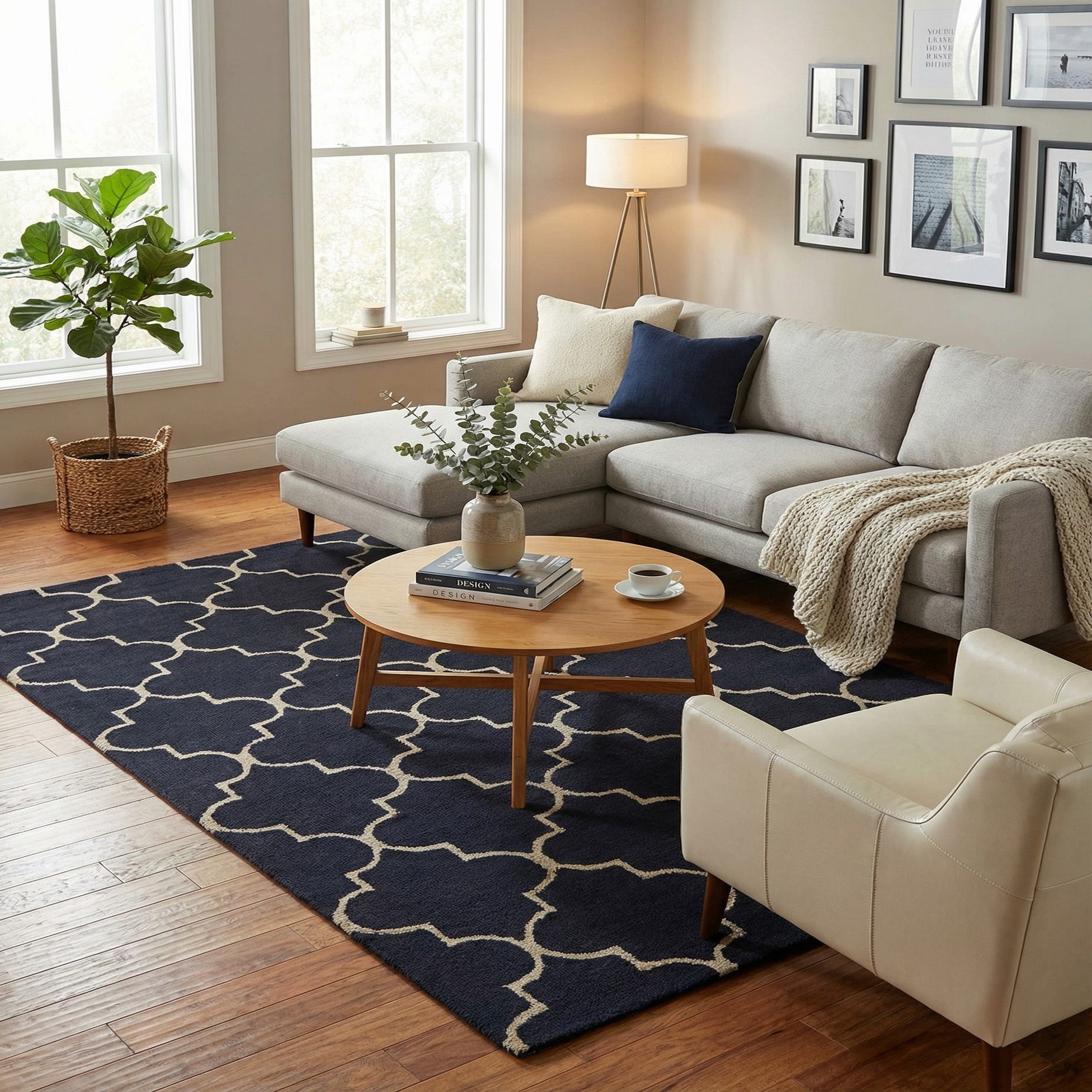 Primary color is Navy Blue. Colors in this rug include: Navy Blue, Ivory.