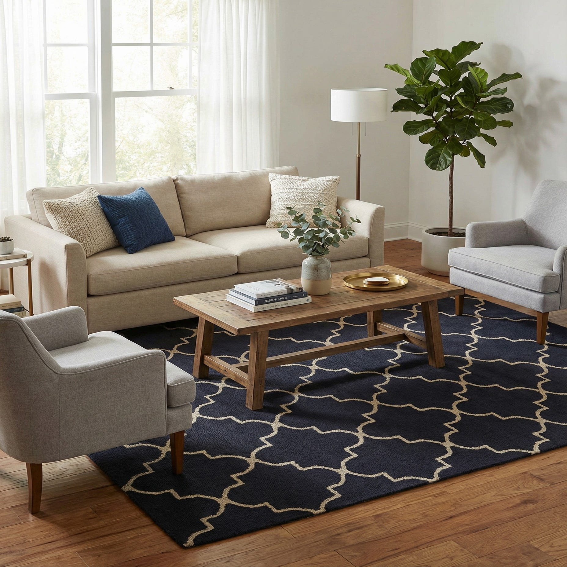 Primary color is Navy Blue. Colors in this rug include: Navy Blue, Ivory.