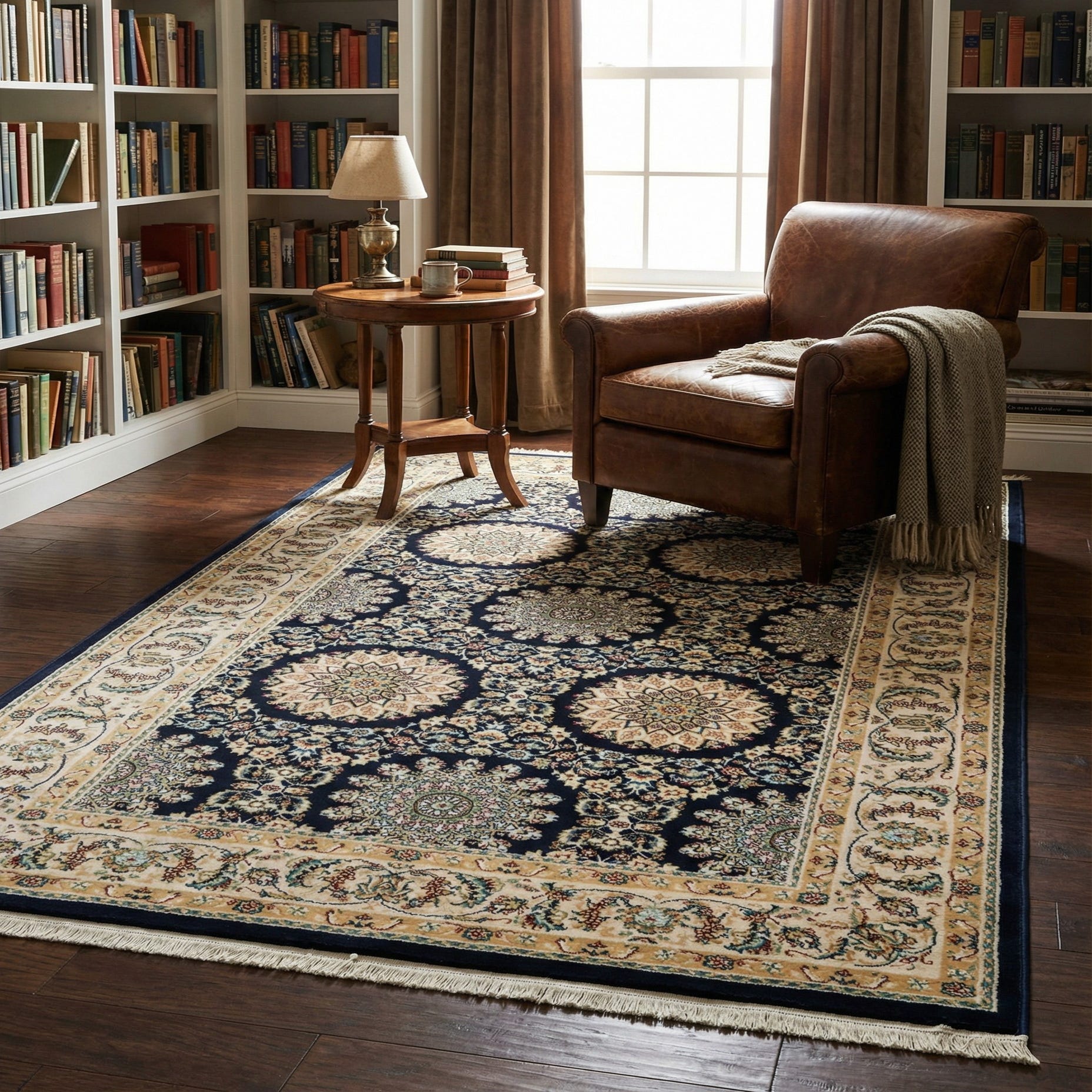 Primary color is Navy Blue. Colors in this rug include: Navy Blue, Beige, Blue, Burgundy, Cream, Green, Ivory, Puce.