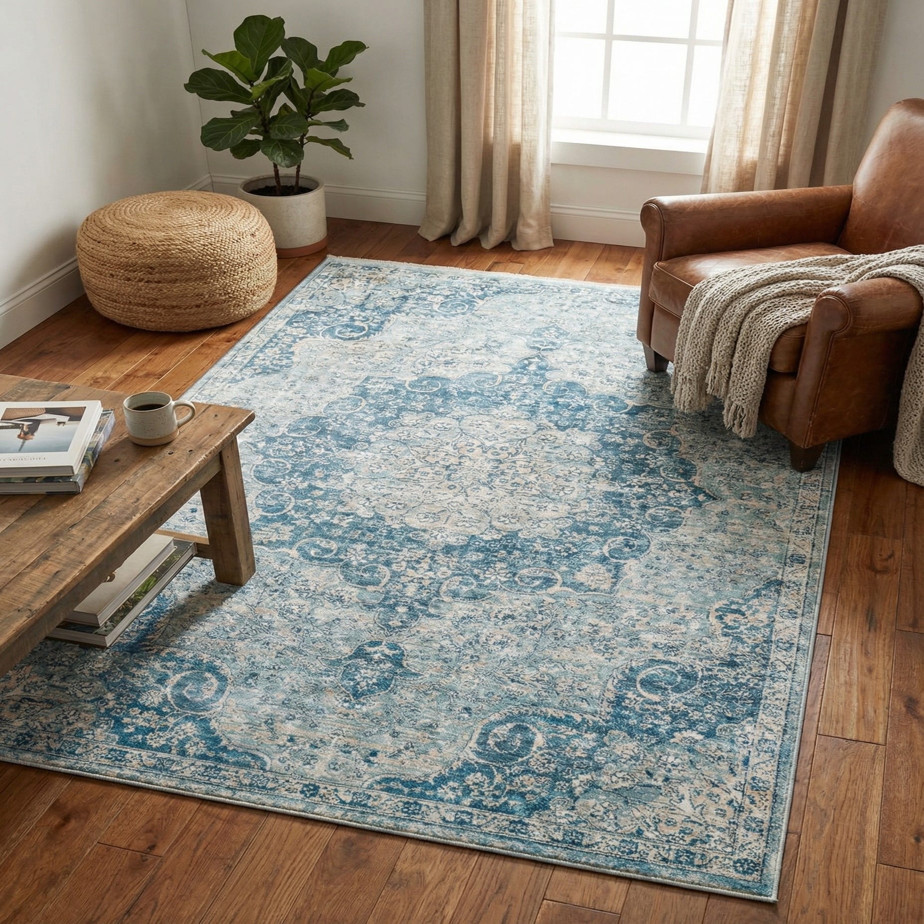 Primary color is Navy Blue. Colors in this rug include: Navy Blue, Light Blue, Ivory.
