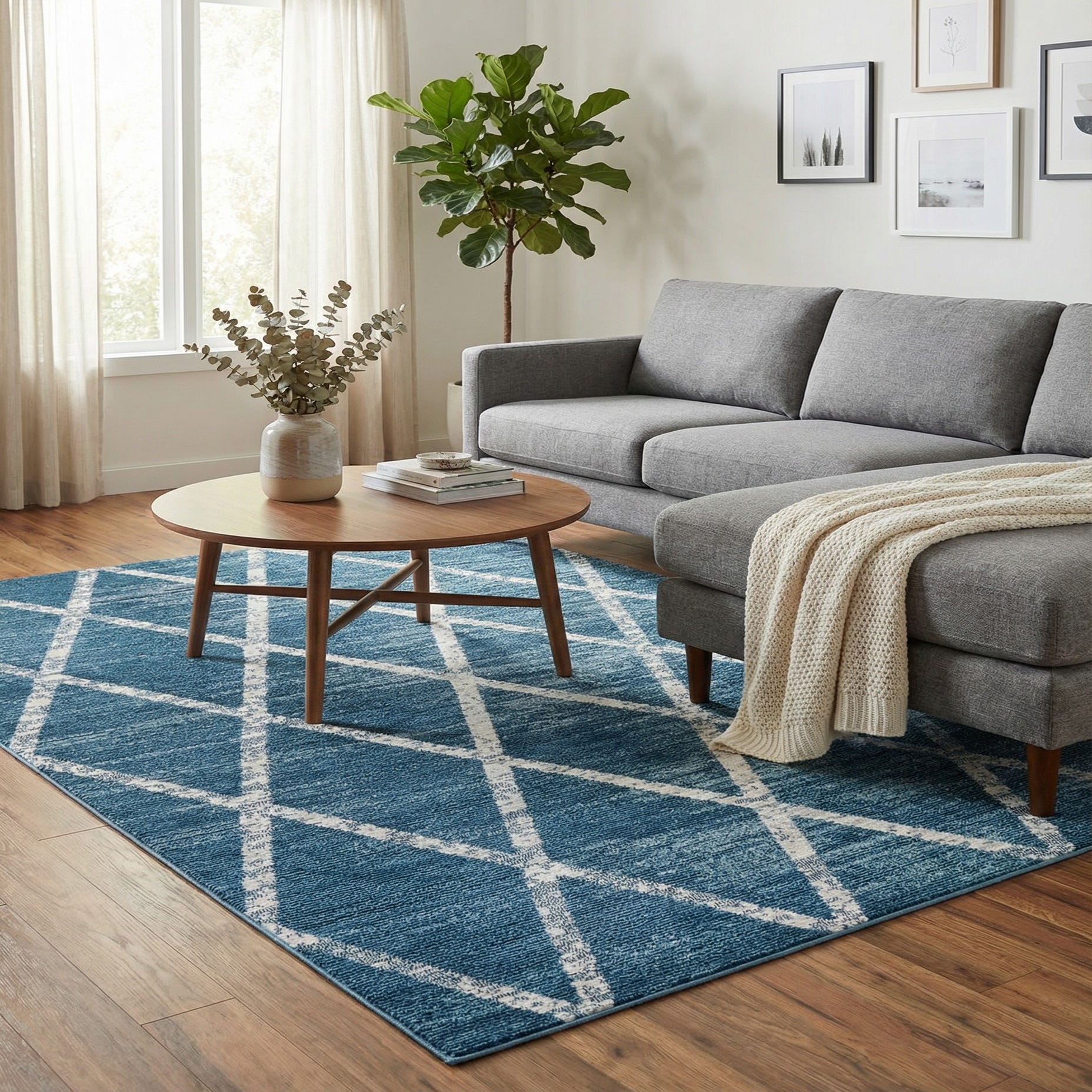 Primary color is Navy Blue. Colors in this rug include: Navy Blue, Beige, Gray, Ivory, Light Blue, Tan.