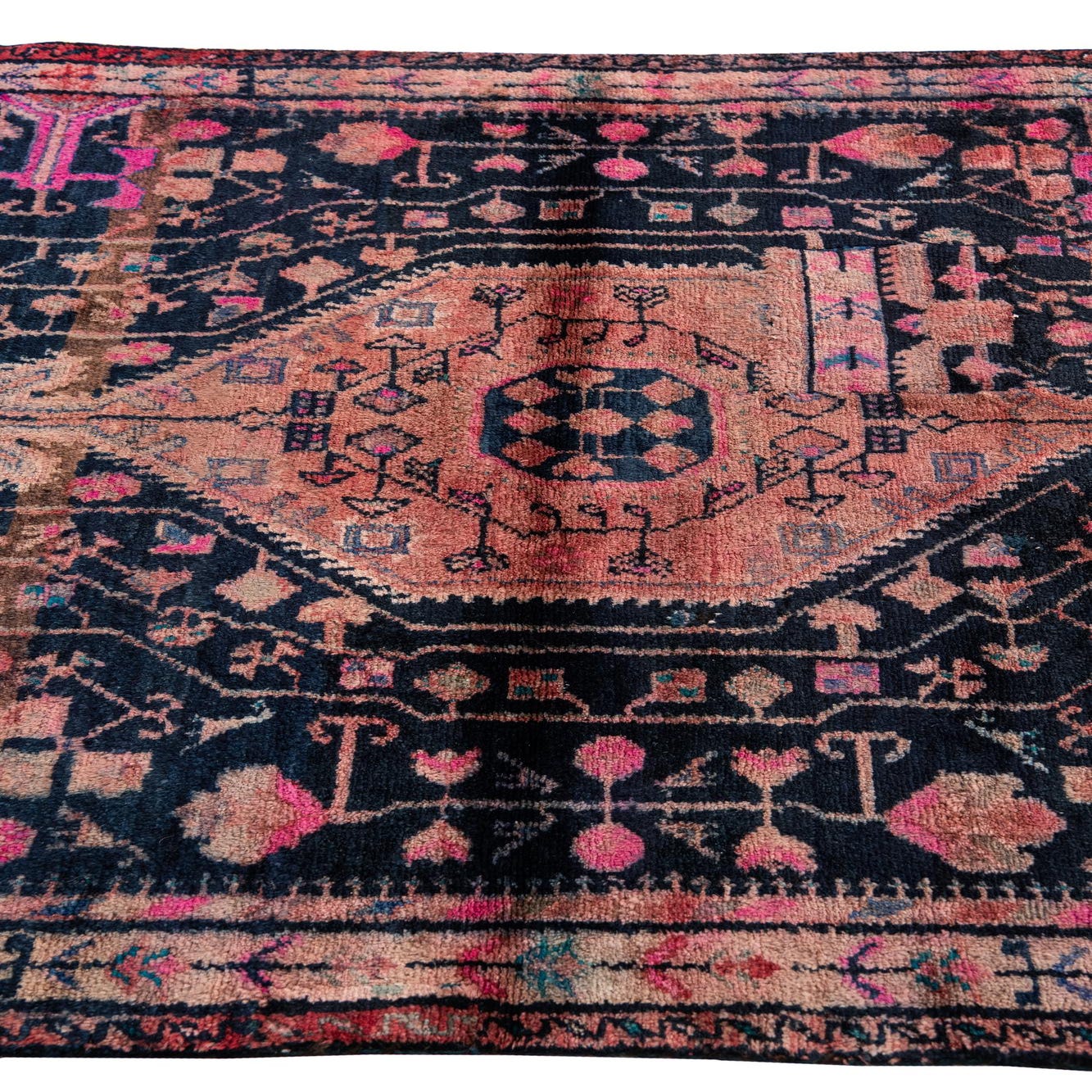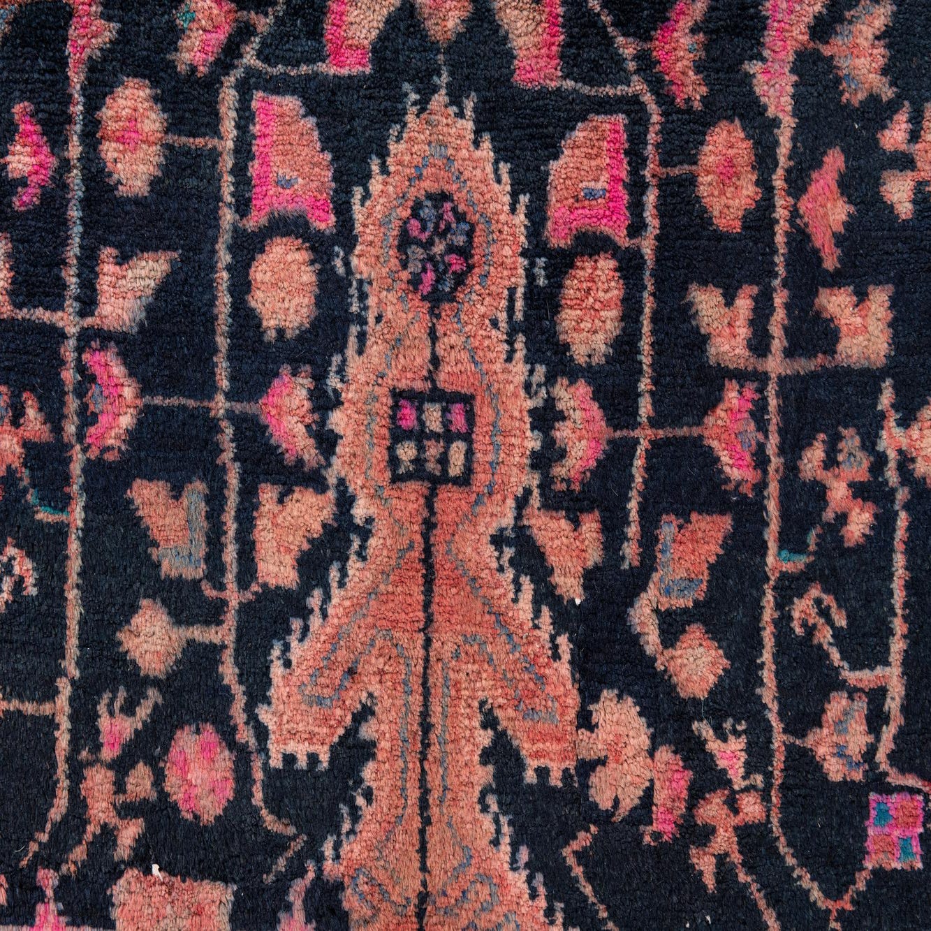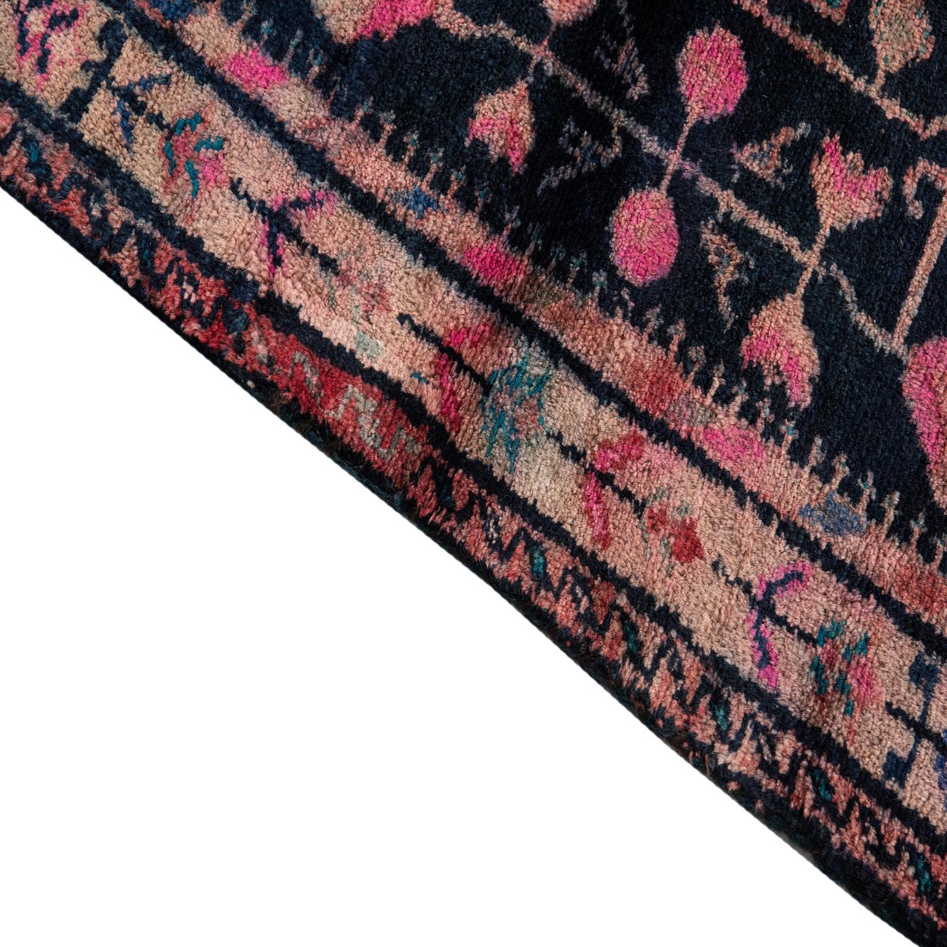 Primary color is Navy Blue. Colors in this rug include: Navy Blue, Brown, Ivory, Red, Pink.