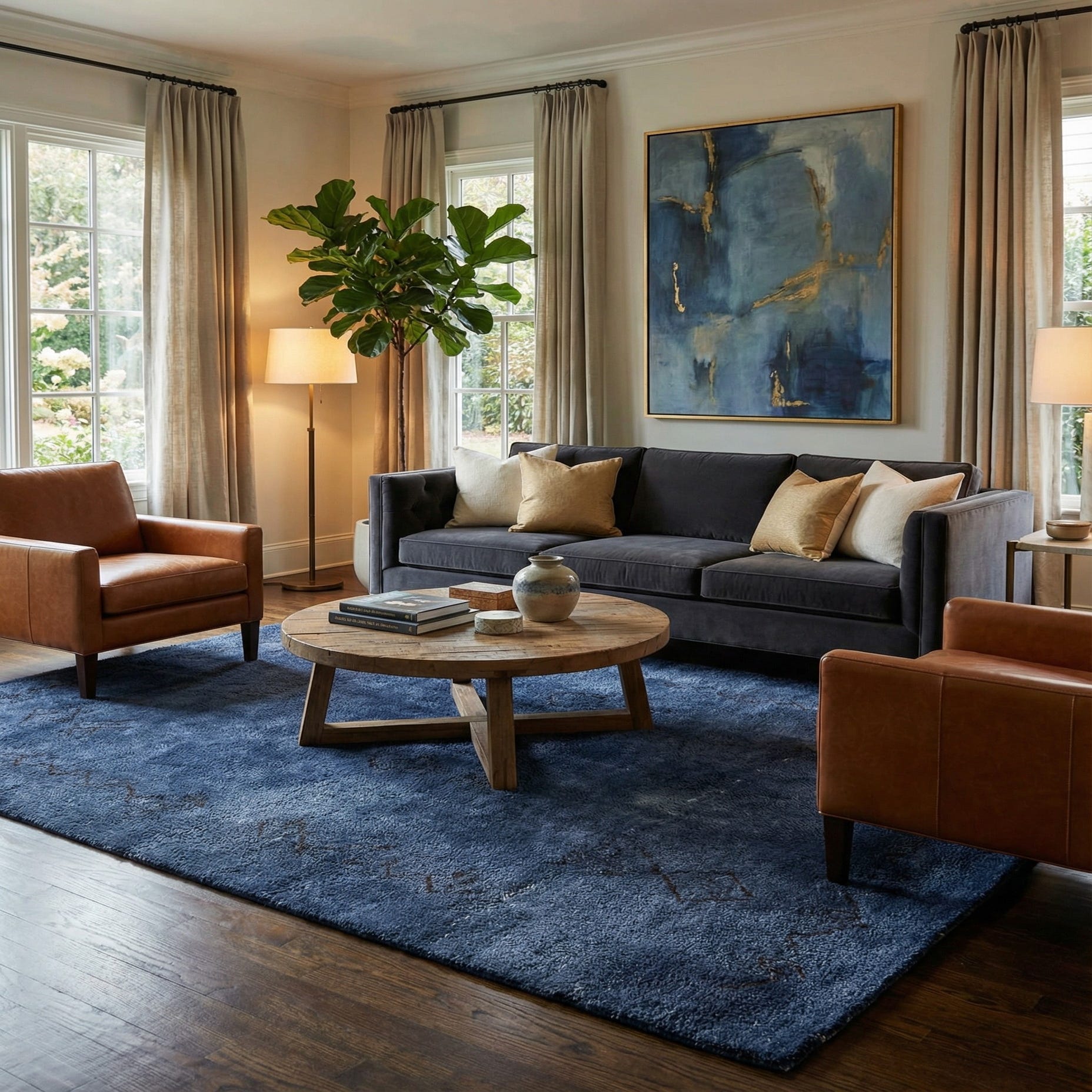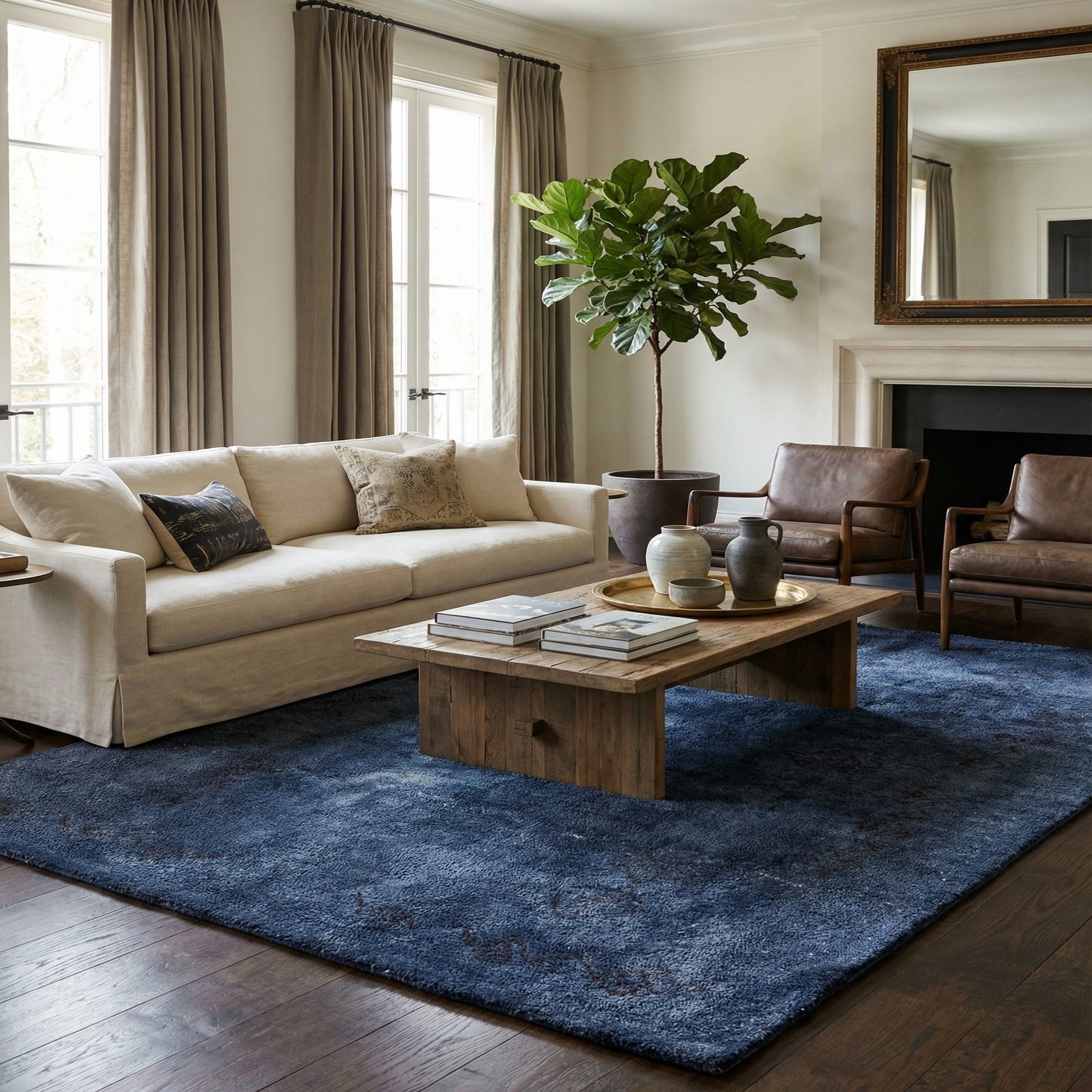 Primary color is Navy Blue. Colors in this rug include: Navy Blue, Black.