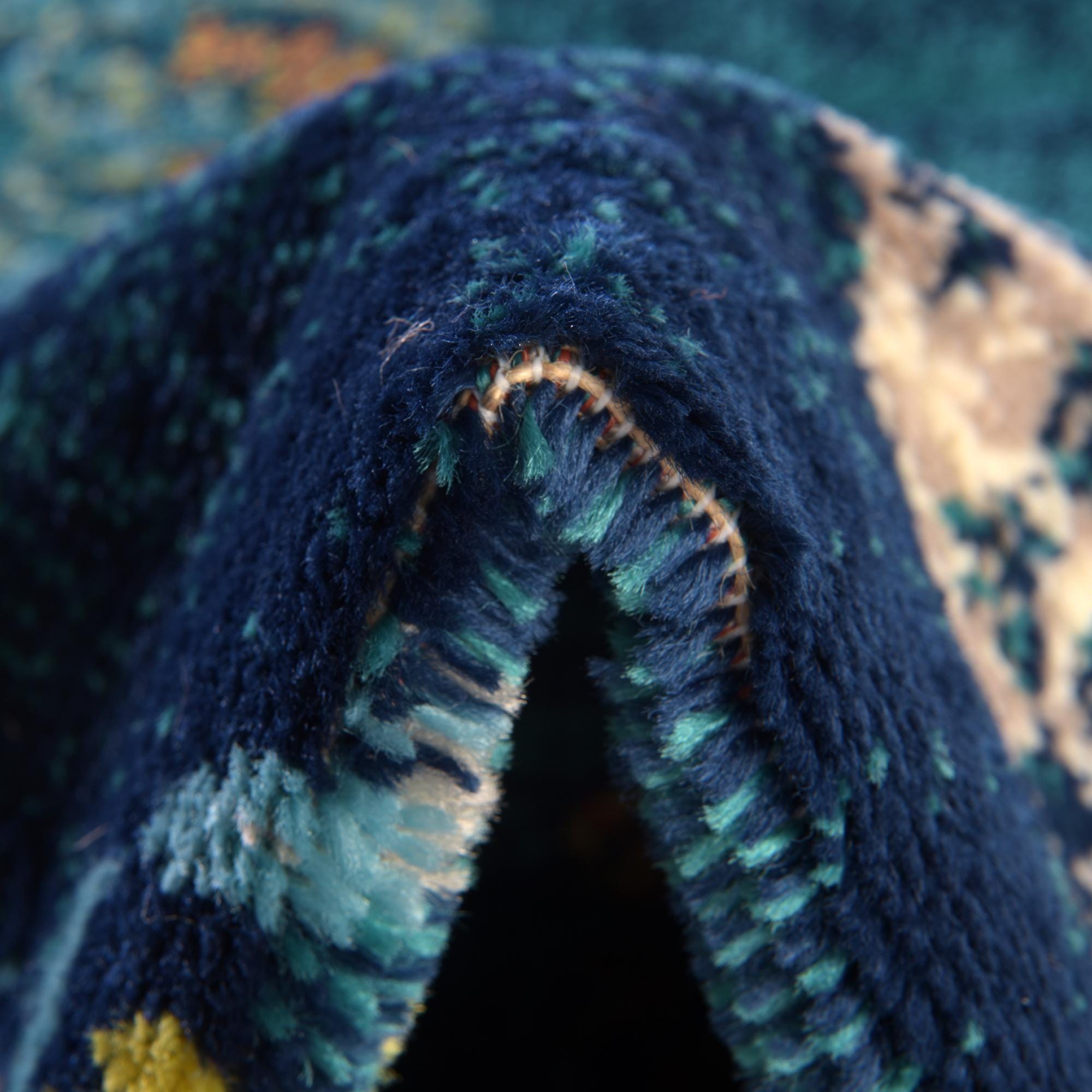Primary color is Navy Blue. Colors in this rug include: Navy Blue, Ivory, Light Blue, Light Green, Orange, Turquoise, Yellow, Pink.