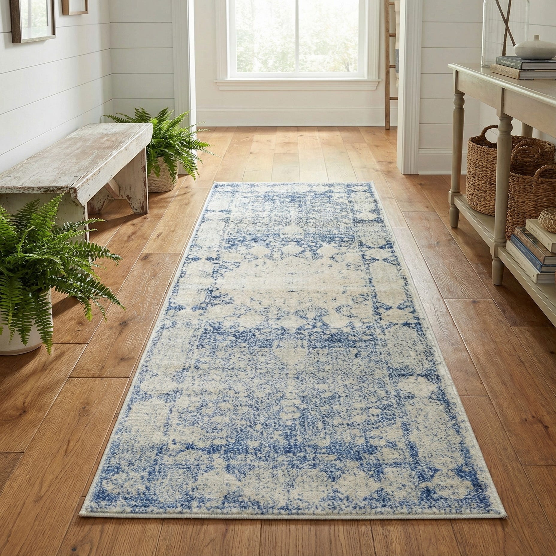 Primary color is Navy Blue. Colors in this rug include: Navy Blue, Gray, Beige.