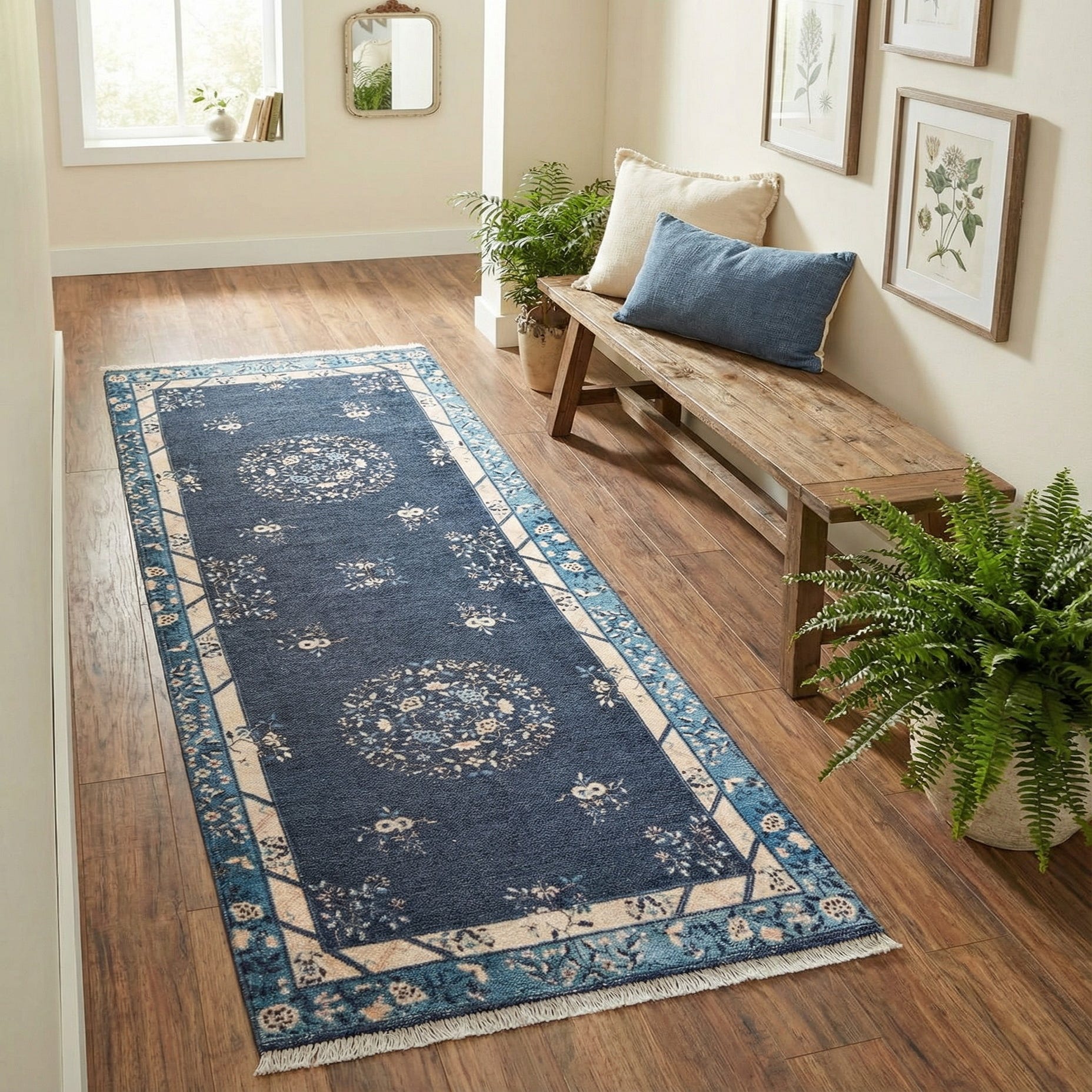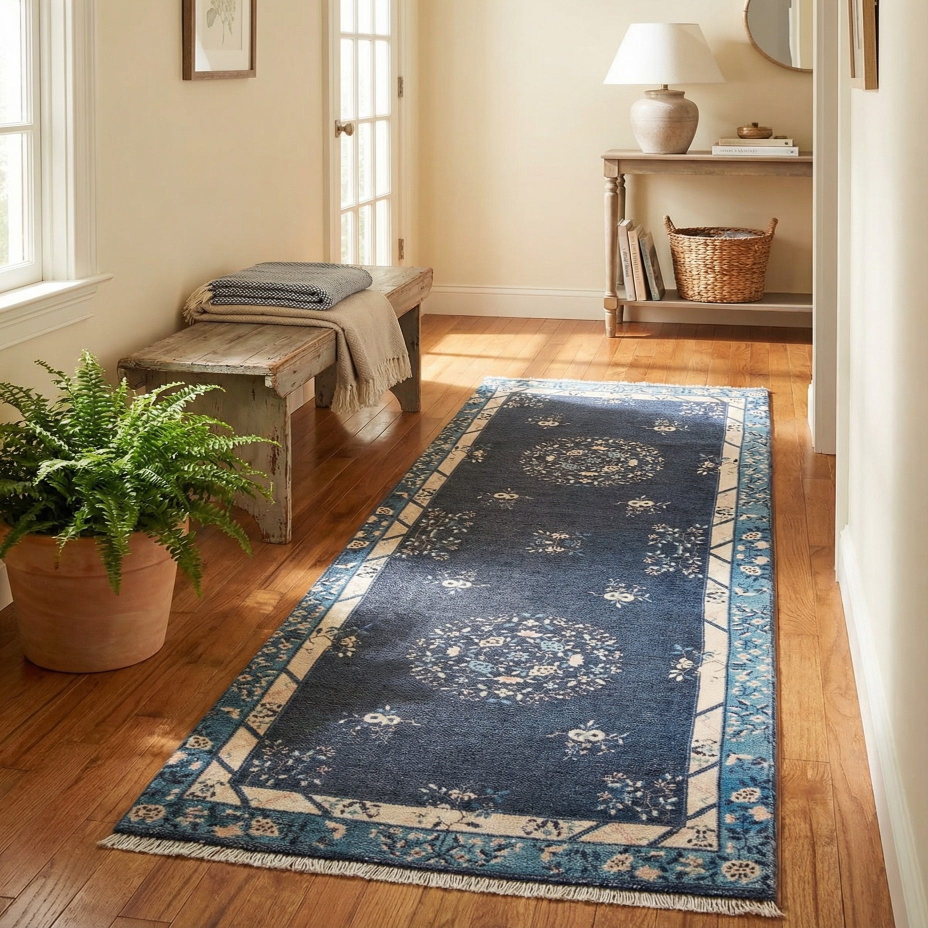 Primary color is Navy Blue. Colors in this rug include: Navy Blue, Ivory, Light Brown.