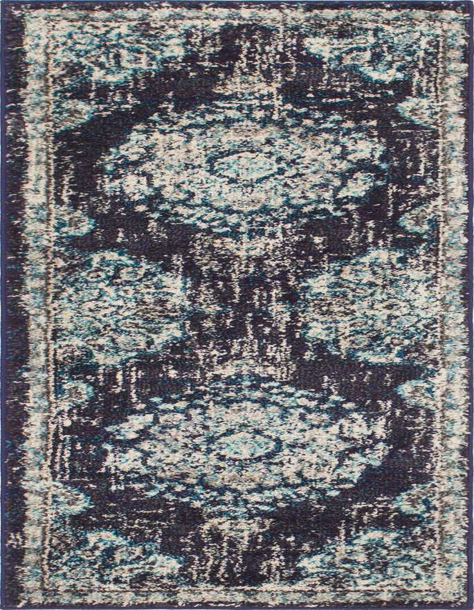 Primary color is Navy Blue. Colors in this rug include: Navy Blue, Beige, Blue, Gray, Ivory, Light Brown.